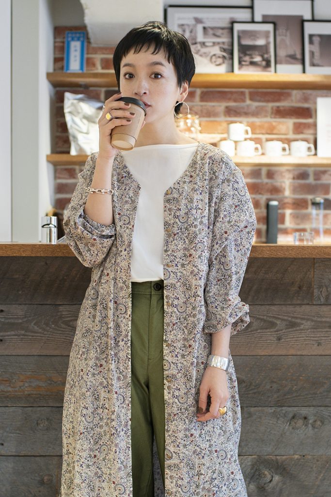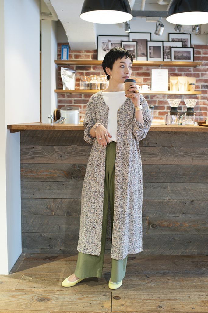 こちらはフロントボタンを全部とめてワンピーススタイルで。