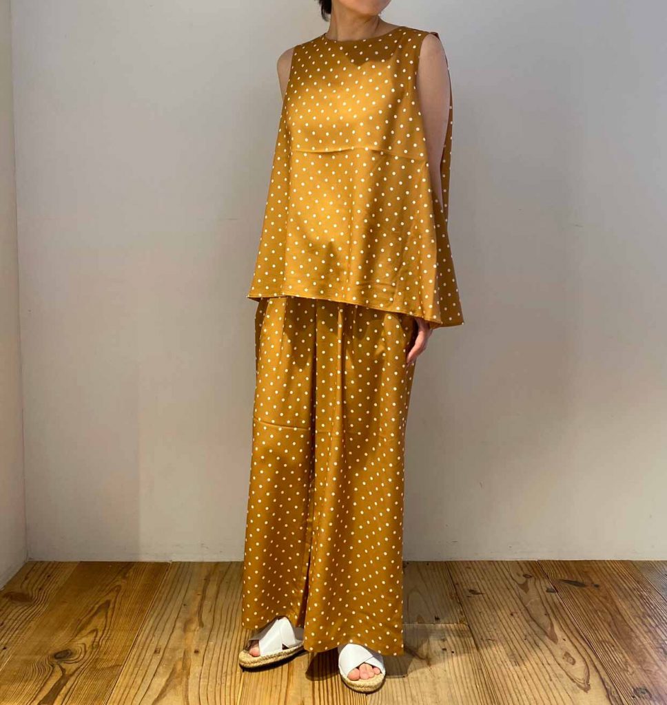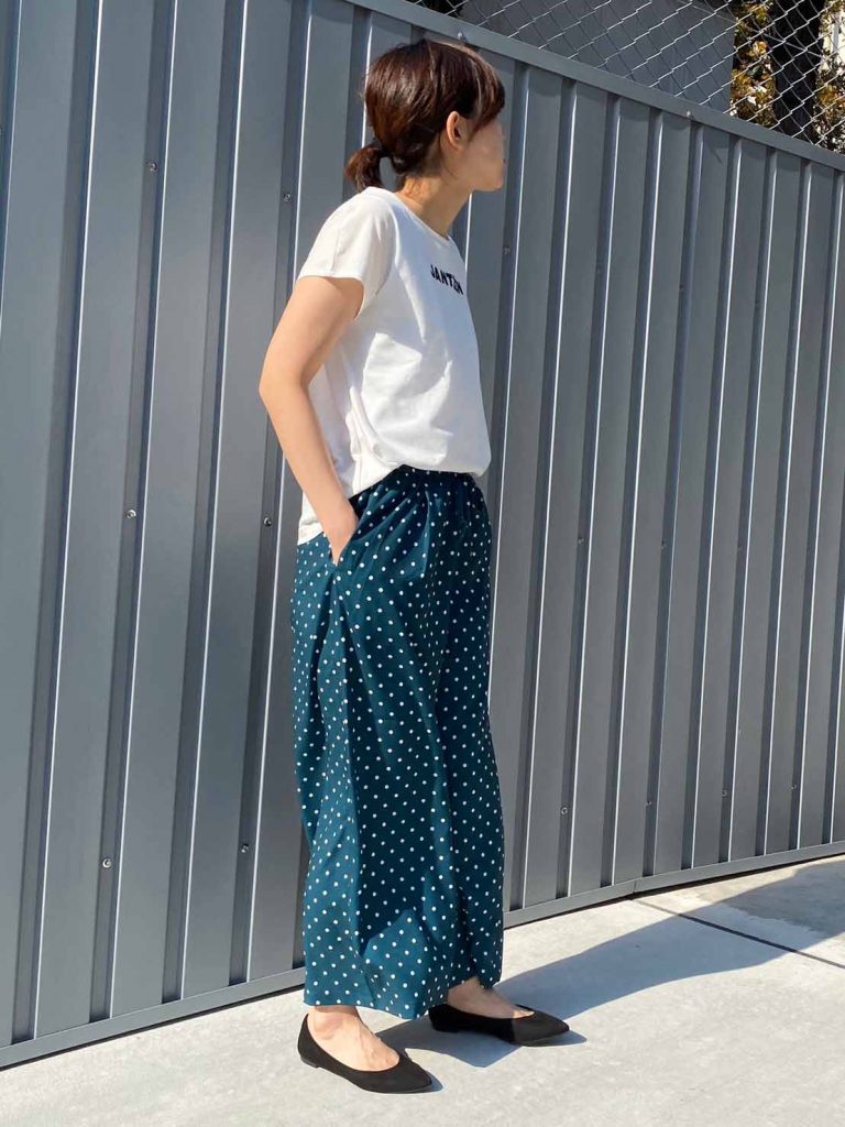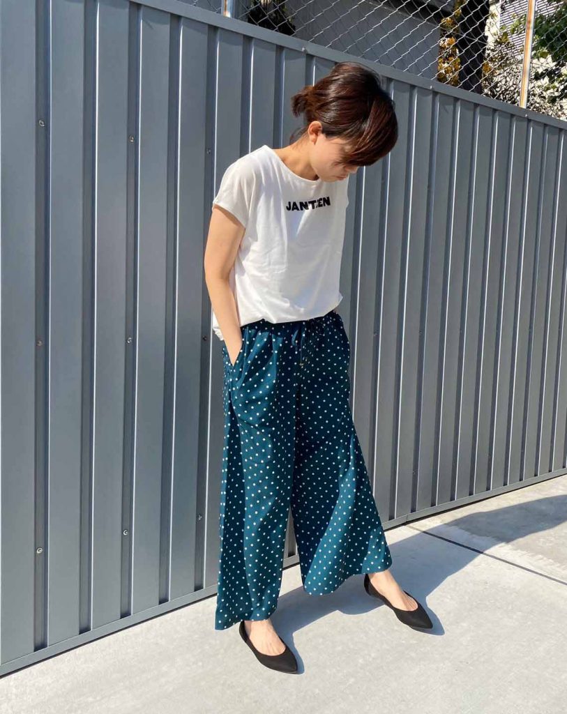 今回はドット柄のイージーパンツとスポーティな