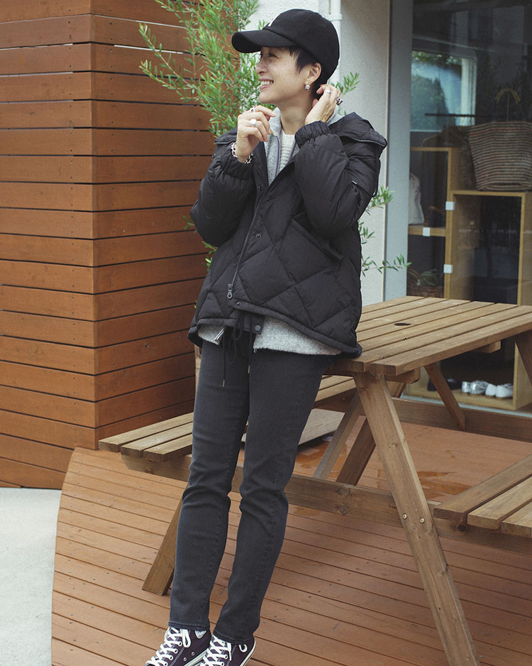 ダウンジャケットを、大人っぽくコーディネイト。