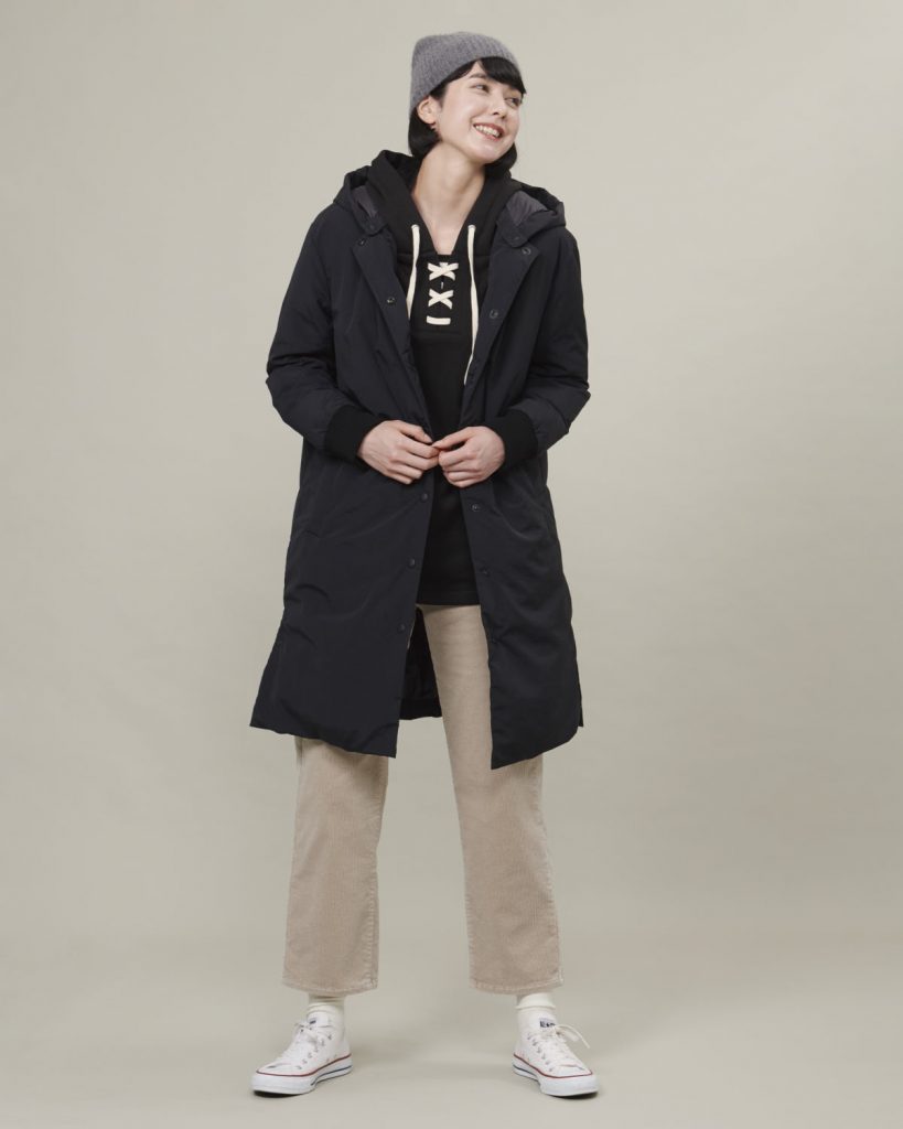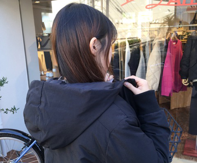 フードをとって衿周りをスッキリとさせたり、