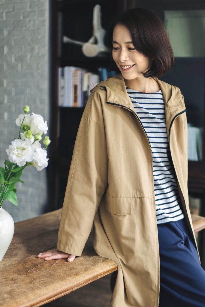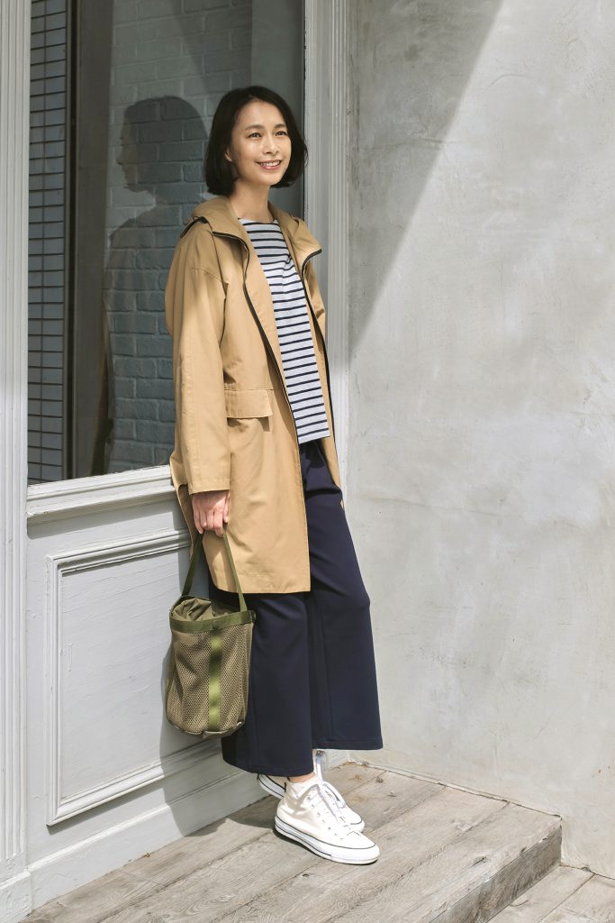 「定番のガウチョパンツは秋仕様のネイビーをチョイス。オーガニックコットンを使用したフレンチシックなボーダーの上にオーバーサイズのフード付きコートをゆったりとまとって。ベージュ×ネイビーのカラーリングが、はずさない上品な大人のカジュアルスタイル♩トレンド感あるシルエットが“今”を感じるポイントです。」