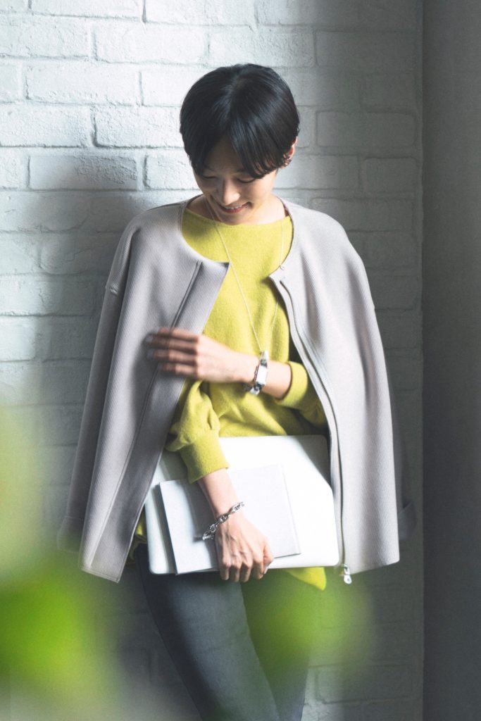 「シンプルなコーデュロイのジャケットは、裏側にフリース生地を貼り合わせる事で保温性を高めたボンディング仕様。インナーにはアシメントリーな裾のデザインがポイントのトップスを合わせて、シンプルなこなれ感のあるスタイリングを。今年のキーカラーでもあるグレー×イエローを合わせたポジィティブなコーディネイトが◎」 |