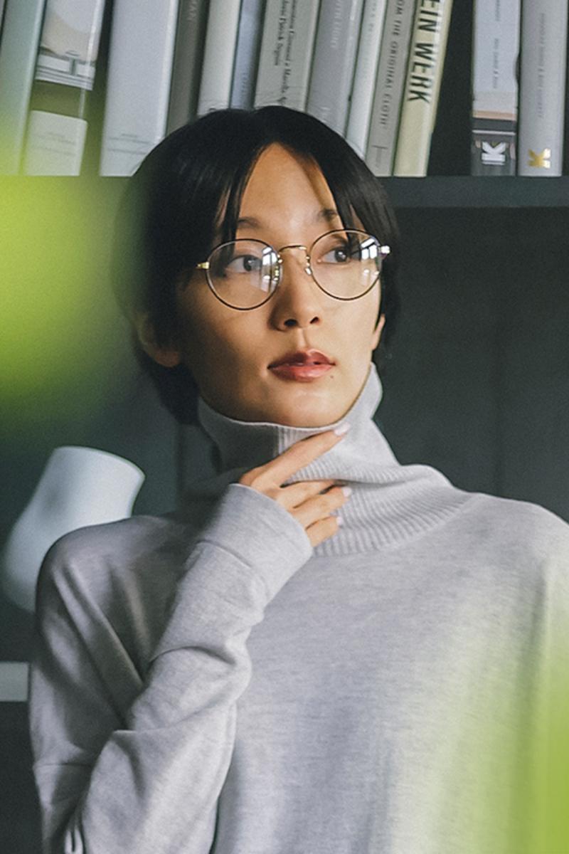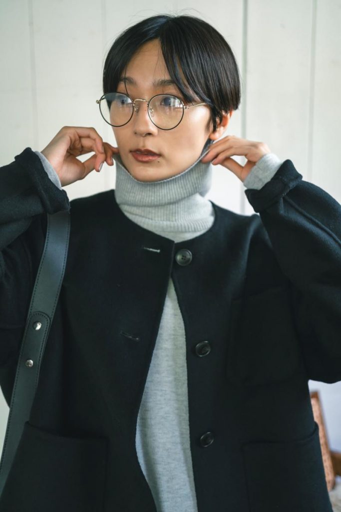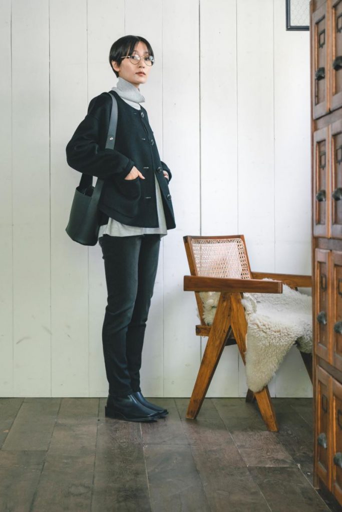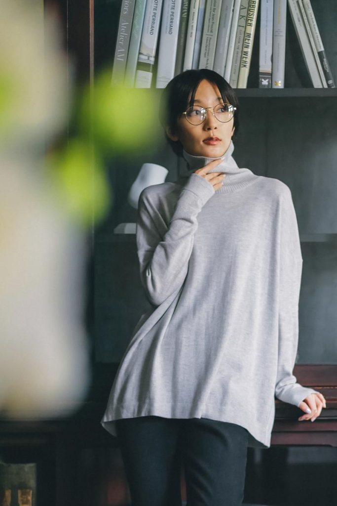 「モノトーンカラーで纏めたクールなコーディネイトだけど、実際に着てみると想像以上にふんわり柔らかな着心地のもので組み合わせたリラクシースタイル。やわらかで自分で形をつくれるタートルネックが、かっちりし過ぎないないエアリーなムードを演出」