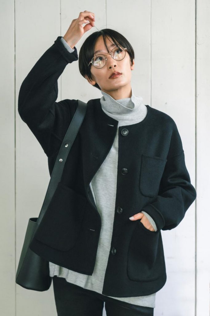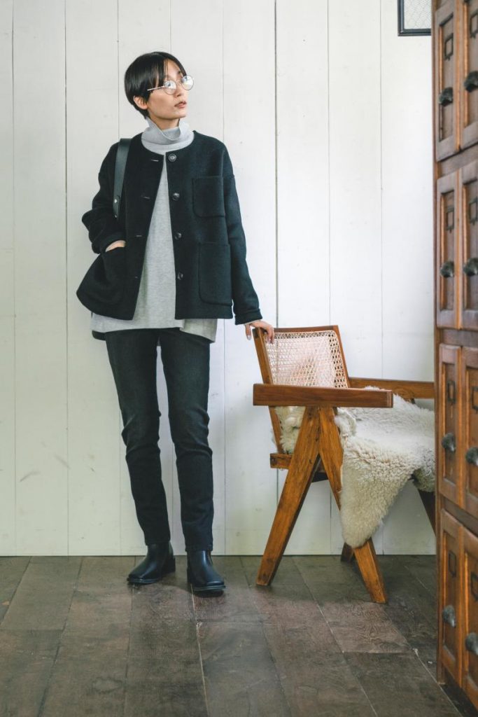 前回に引き続きモデルのmotokoさんに、驚くほど軽く仕上げたウールのノーカラージャケットをリコメンド。 ポイントは、色数を抑えたクールなリラクシーコーディネイト。是非手にとって試してみてください♪