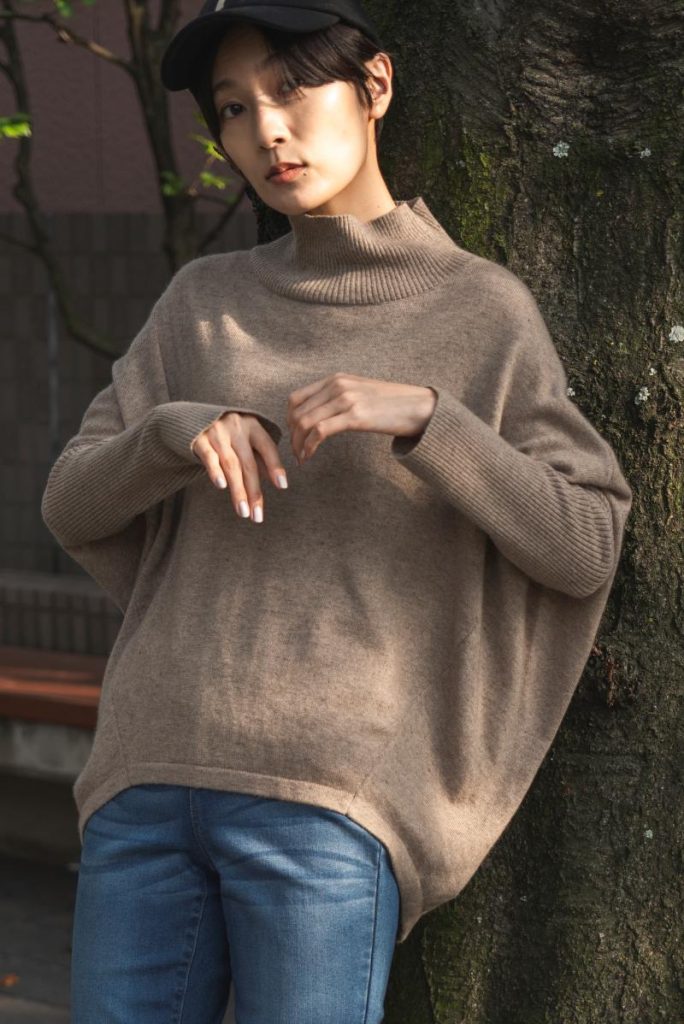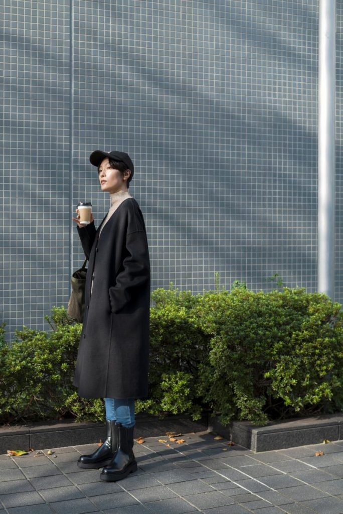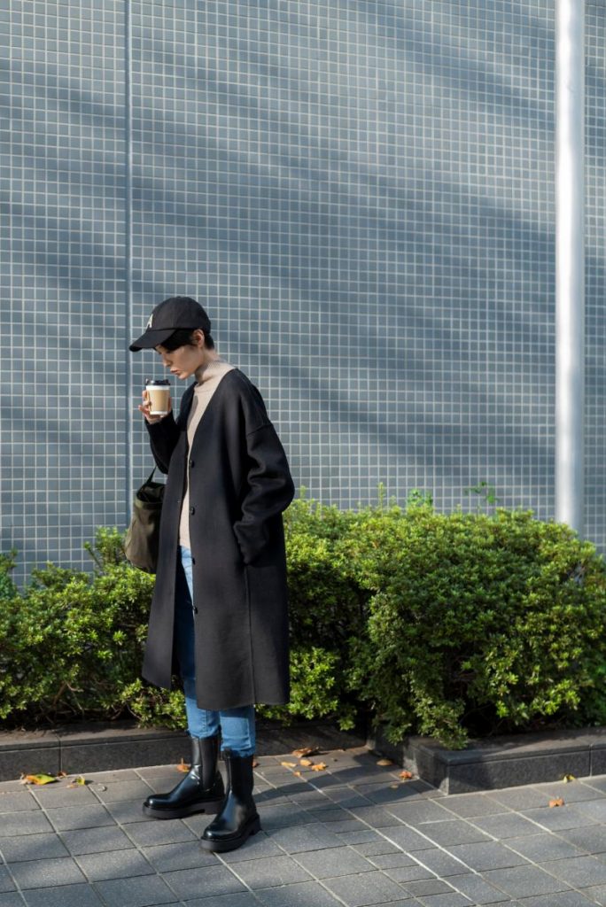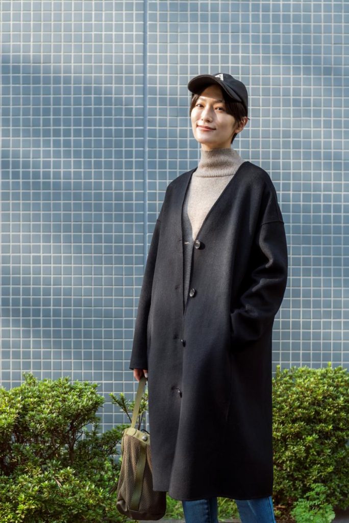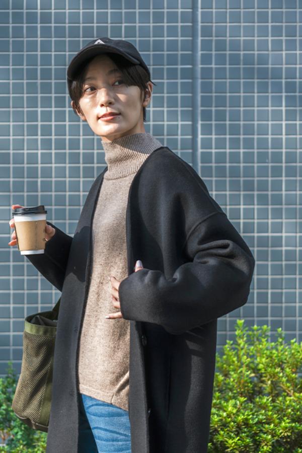 「リバー仕立て(※素材を2枚張合わせる仕立ての事。素材の高級感upと綺麗なシルエットを作る事が出来ます)のウールの肌触りが、抜群に気持ちいい。ふわりと落ちるシルエット、ドロップショルダー、大きめな袖、と“旬”が詰まってます♩Vゾーンがスッキリしているからインナーには緩めのハイネックを合わせて。キャップとナイロンバッグを合わせたカジュアルなコーディネートが今年っぽい♩」 |