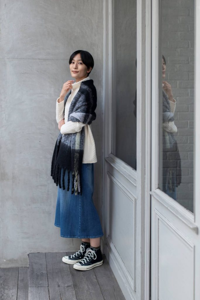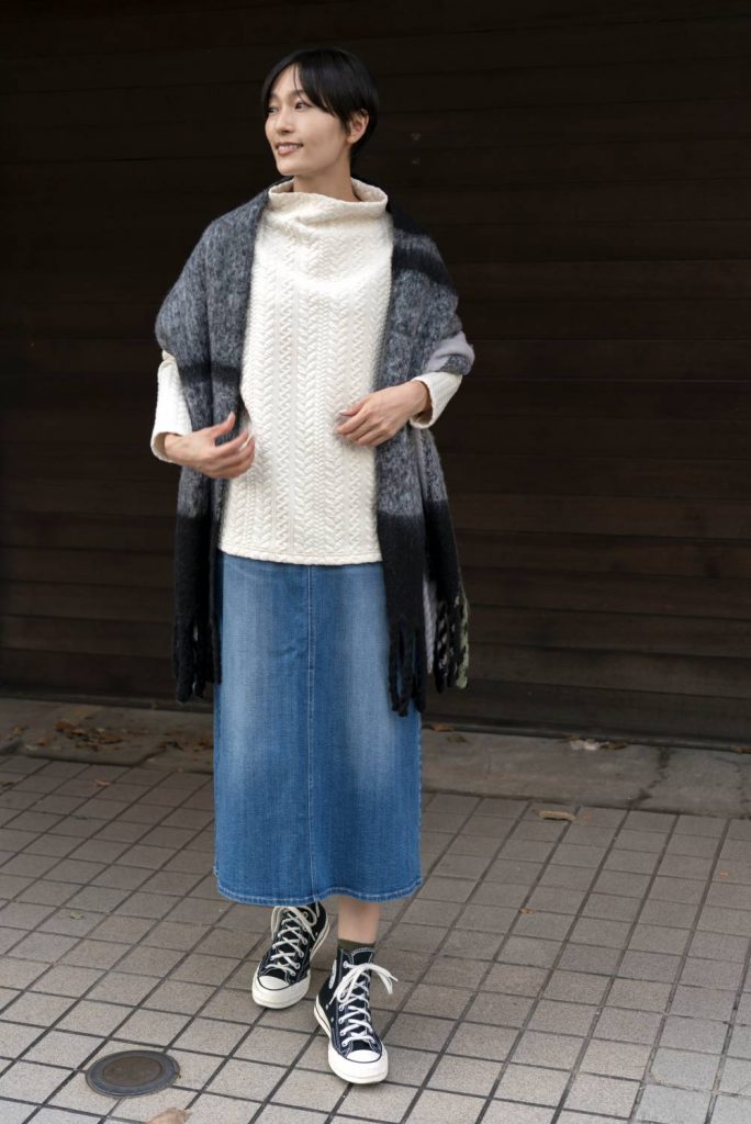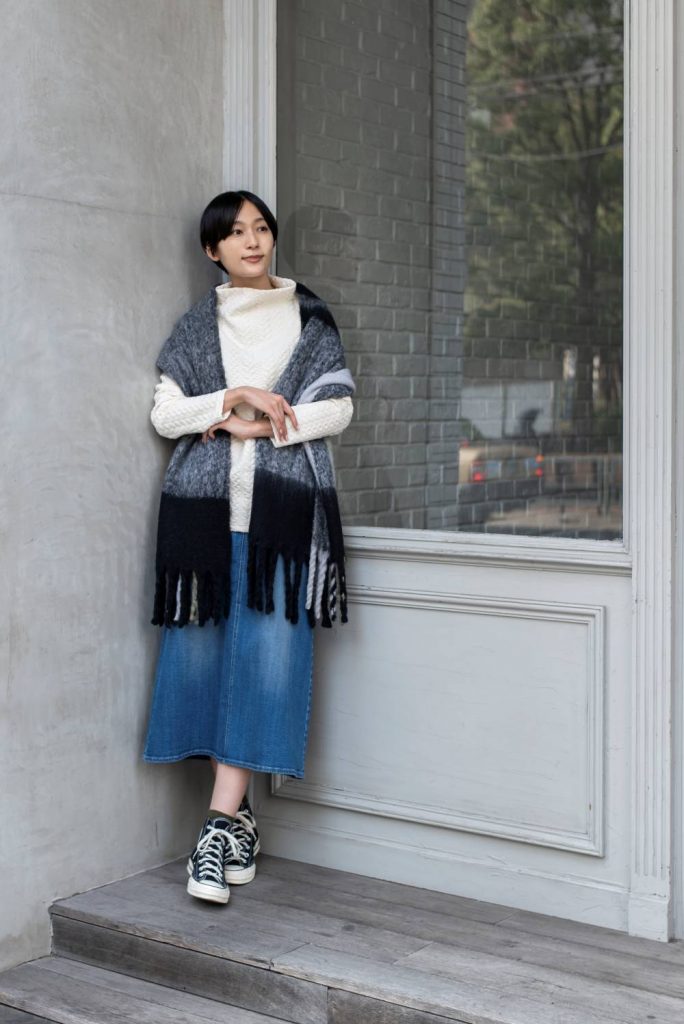 「1枚で着ても映える立体的な表情のジャカード生地を使用したプルオーバーは、自由に形をつくれるボトルネックの襟がポイント。カジュアルに少し色落ちさせたデニムスカートに、ボリューム感たっぷりの大判ストールを合わせて。街で着る新しいオーセンティックなリラクシースタイルが今年ぽい♩」 |