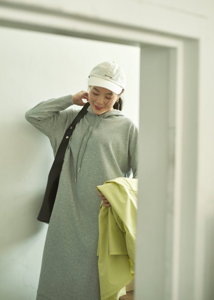 フードロングワンピース」は、しっかりした生地感で、絶妙に計算されたシルエットやサイドスリットのディテールも相まって、スウェットワンピ選びをする上で気になるルームウエア感はなし。着心地よくって楽ちんだけど決まる服。そうそうこんなの欲しかったんです。
