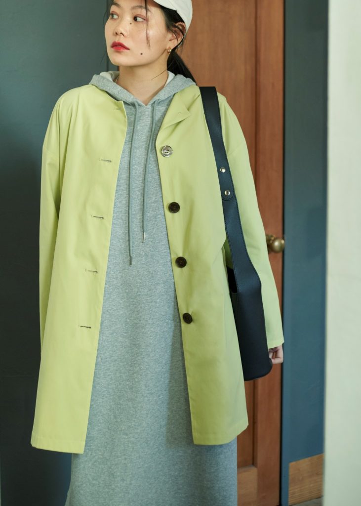 ノーカラー ショートコート」。さっと羽織れば新たな春のムードを纏うことのできるアウターと、ラフな抜け感がグッドなスウェットワンピースをコーディネートしたら、ヘルシーでこなれたカジュアルスタイルに。