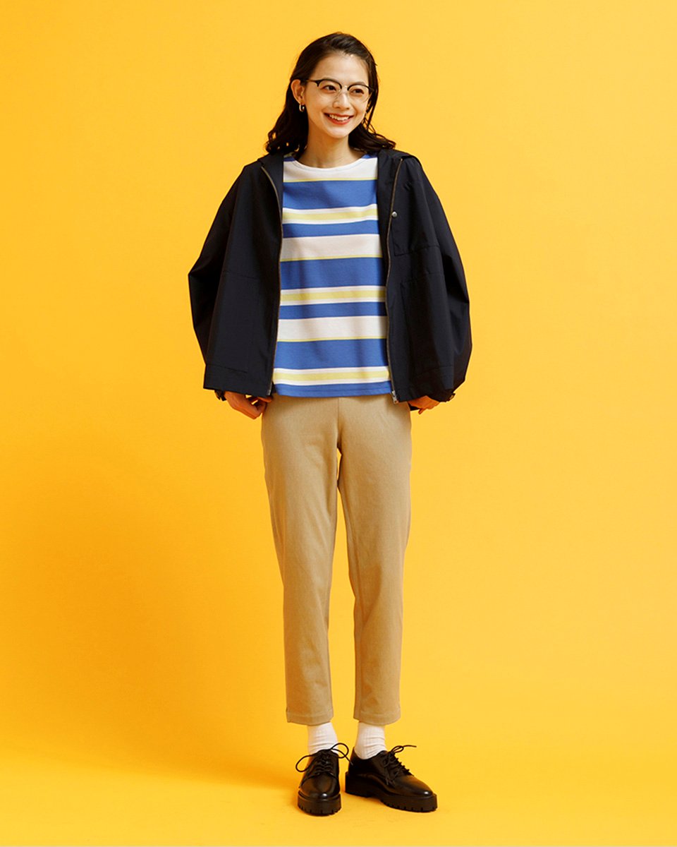 デイリーにもレジャーにも、 様々なシーンで活躍する撥水パーカに 差し色の水色を効かせたメリハリコーデ。 視線を上に集めてくれるショート丈アウターは スタイルアップ効果も◎