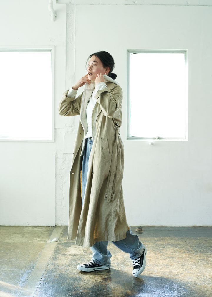 雨の日や冬の寒さが残る春の日は、羽織るものがライトな春アウター一枚だと肌寒く感じることも。そんな時は「グレーパーカ」をライナーのようにレイヤード。トレンチコートからパーカのフードを出して、ラフで大人っぽいコーディネートに。シューズとバッグの“黒”でスタイリングを引き締め、シックにバランスよくまとめて。
