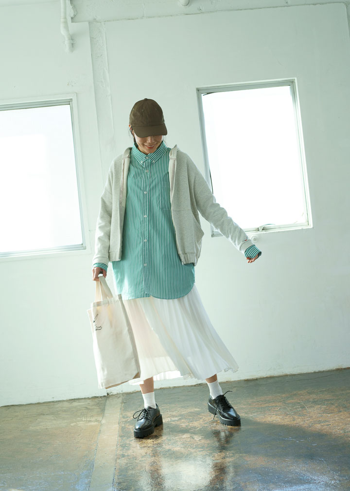 朝夕の寒暖差に備える春先の羽織モノとしてもパーカは大活躍。今回は、パーカを主役にシャツやキャップを合わせて、ストリート感のあるスタイリングに。ボトムはプリーツスカート、足元にはドレスシューズを取り入れて、シックな雰囲気もプラスすることで、ボーイッシュ:フェミニンシック、5:5のバランスのカジュアルルックに。