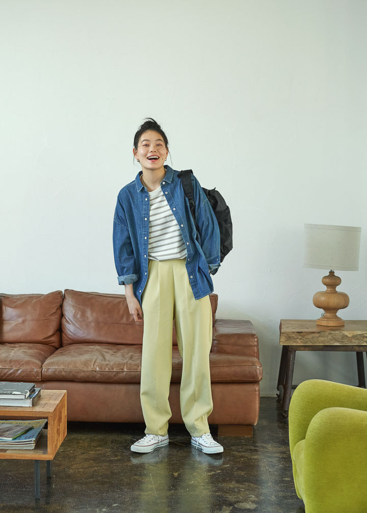 ライトな羽織モノが欲しい時にもデニムシャツが活躍。今回は、ボーダーカットソーとイエローのパンツにデニムシャツを羽織ってコーディネート。足元はキャンバススニーカー、バックはバックパックをチョイスしてカジュアルにまとめて、街歩きはもちろん、BBQやピクニックといったちょっとしたアウトドアの際にも似合うスタイルに。