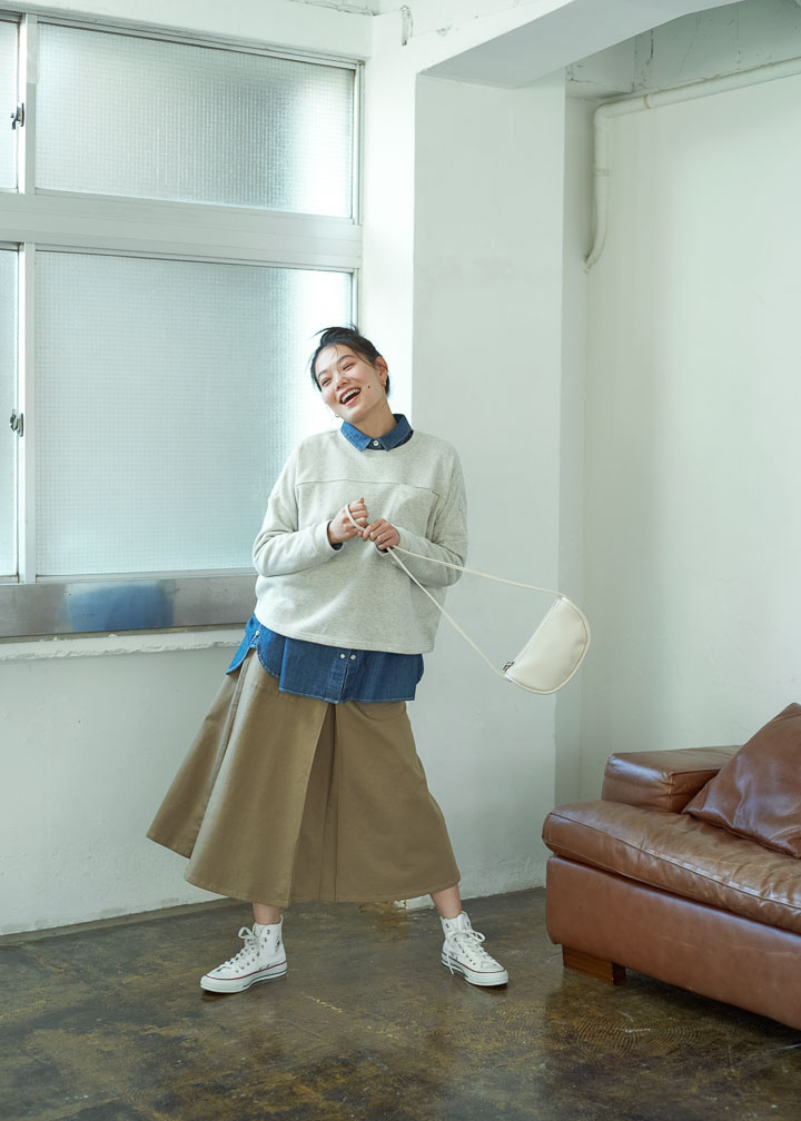 デニムシャツ¥9,900、プルオーバースウェット¥ 6,600、スカート¥8,800/ジャンセン その他 スタイリスト私物 *記載の価格は税込