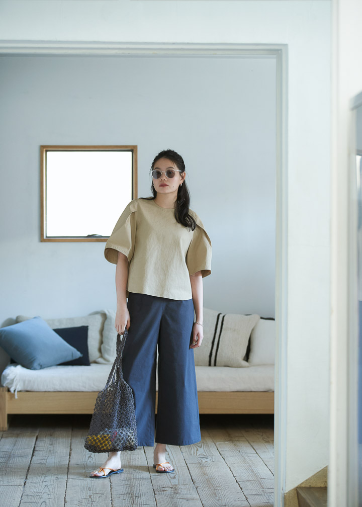 少しきちんと感のあるスタイルがしたいときにもガウチョパンツはおすすめ。サンドカラーのブラウスと合わせて、カジュアルシックにスタイリング。コーディネートを彩るファッショングッズは、サングラス、ネットバッグ、サンダルの3つのサマーアイテム。抜け感がありながらもラフすぎず、きれいめな印象を演出できる着こなしに。