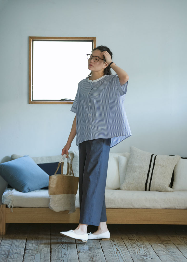 春先から愛用できるガウチョパンツ。初夏には、上品な半袖ブラウスと合わせてみたい。このストライプ柄のブラウスも今季の新作。ライトブルーとネイビーを貴重としたスタイリングは、どこかマリンなムードが漂う。ブラウスの白い襟とリンクする“白”をバッグとシューズで取り入れて、コーディネートにさわやかな明るさもプラス。