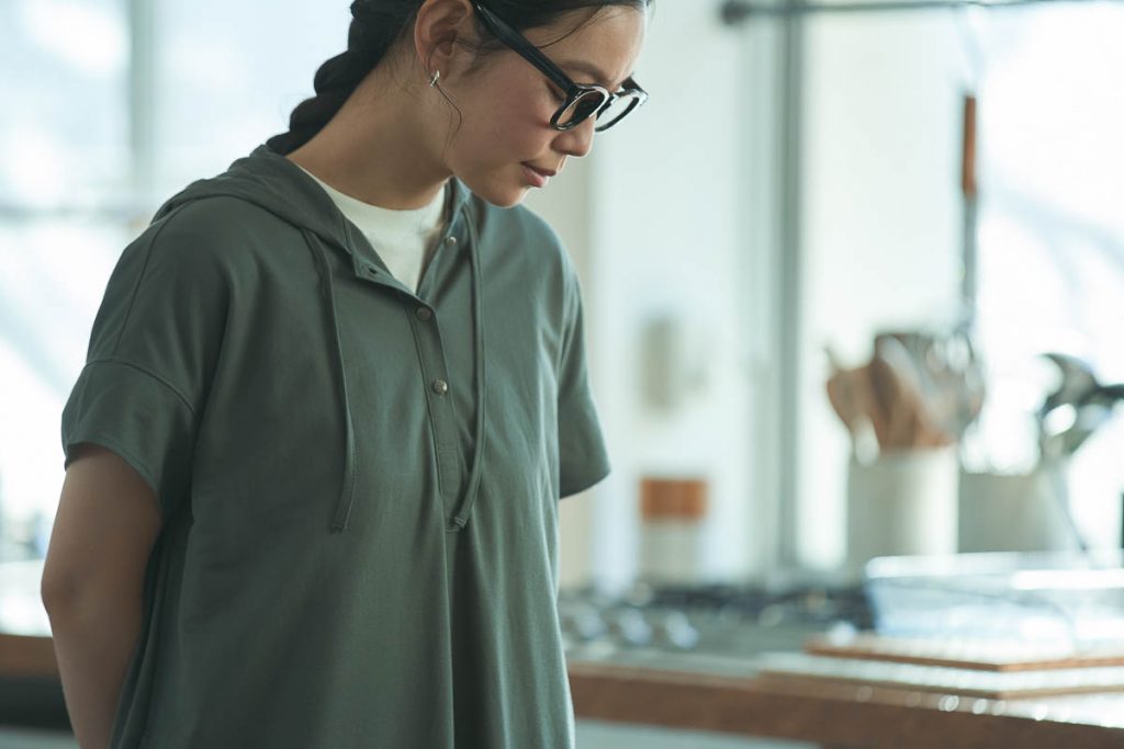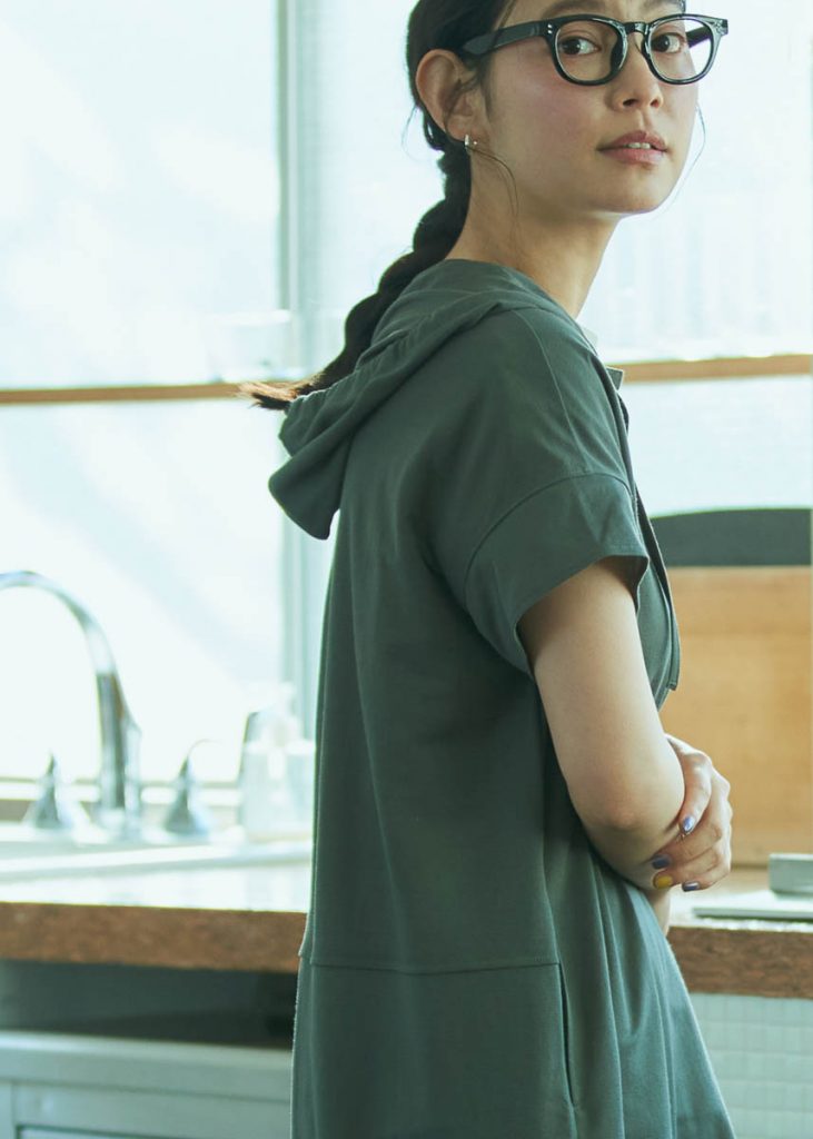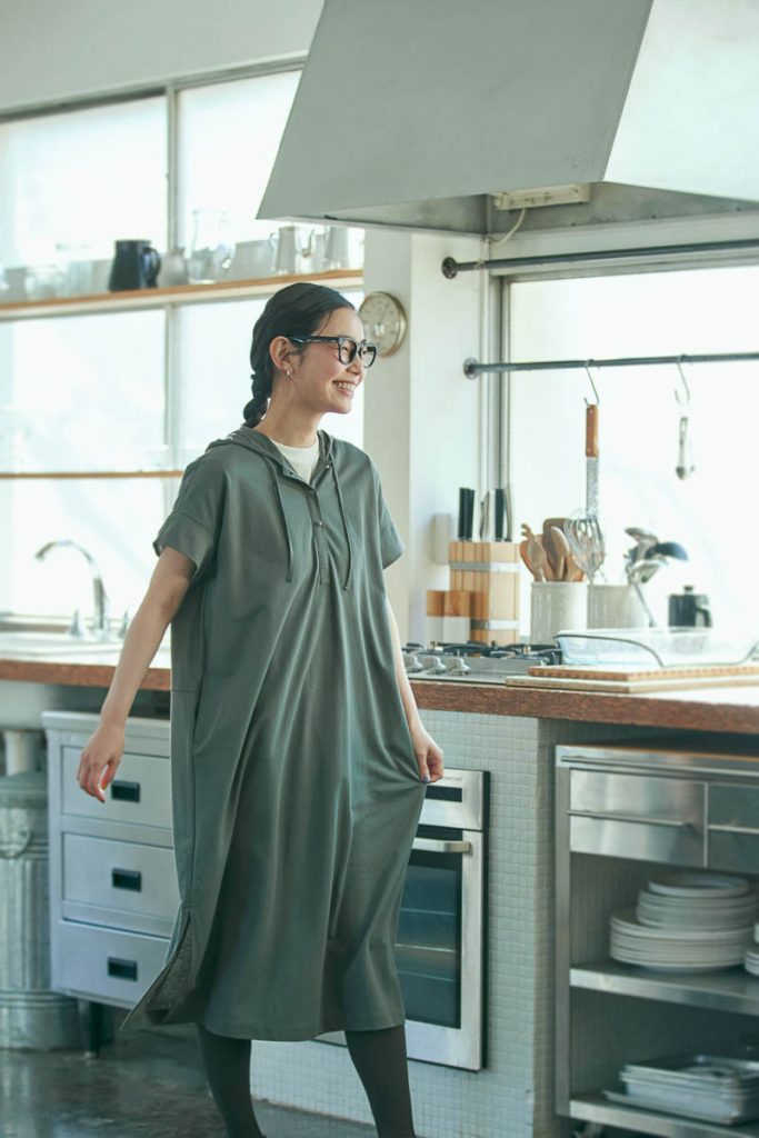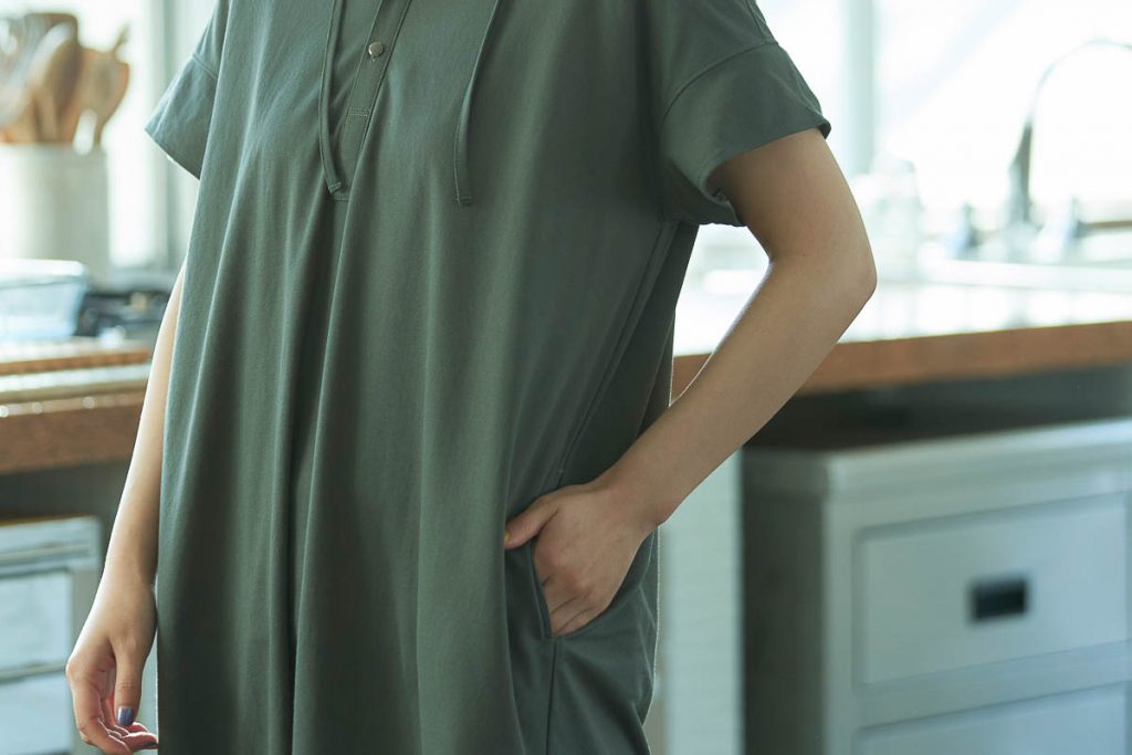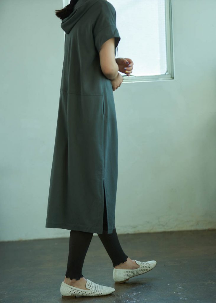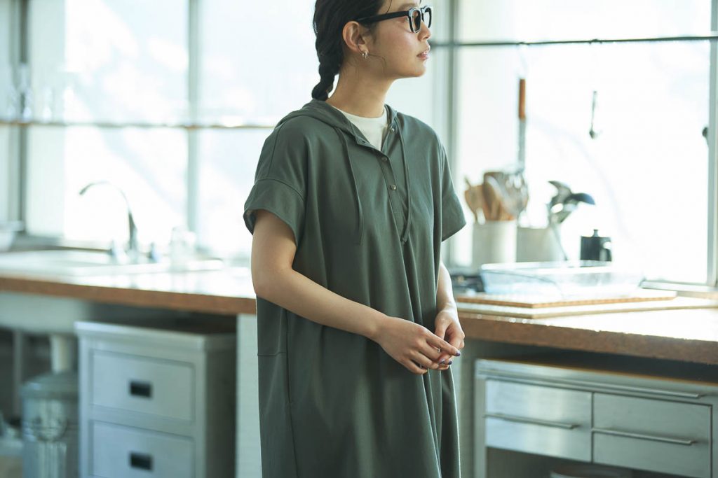 ジャンセンで人気の“マイクロカノコ”生地を使って仕立てられたフード付きワンピース。さらりとした肌触りの素材感で、今の時期から夏場にかけて心地よく着られる。裾の両サイドには、スリットが入っており、足捌きの良さも◎。今回のようなコーディネートの他、バケットハットやスポーツサンダルといったアイテムとの相性も良いので、日常のワードローブとしてはもちろん、BBQやハイキングなど、ちょっとしたアウトドアの際にも選びたい一着。