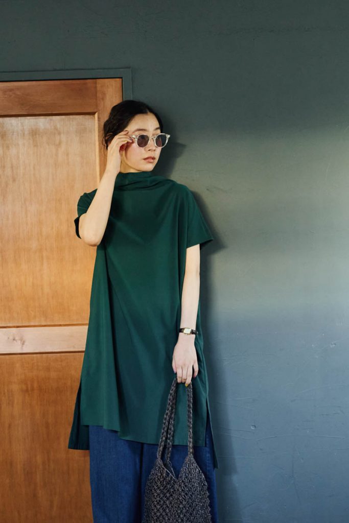 ゆったりとしたオフタートルネックで、スタイリングにエレガントなニュアンスを与えてくれるチュニック。夏場も心地よく着られるドライタッチな生地感で、ストレッチも効いているので動きやすくストレスフリーな着心地。気になる二の腕周りをカバーする絶妙な袖丈もポイントです。また、今っぽく抜け感のあるレイヤードスタイルを楽しめる、両サイドの深めスリットもこだわり。