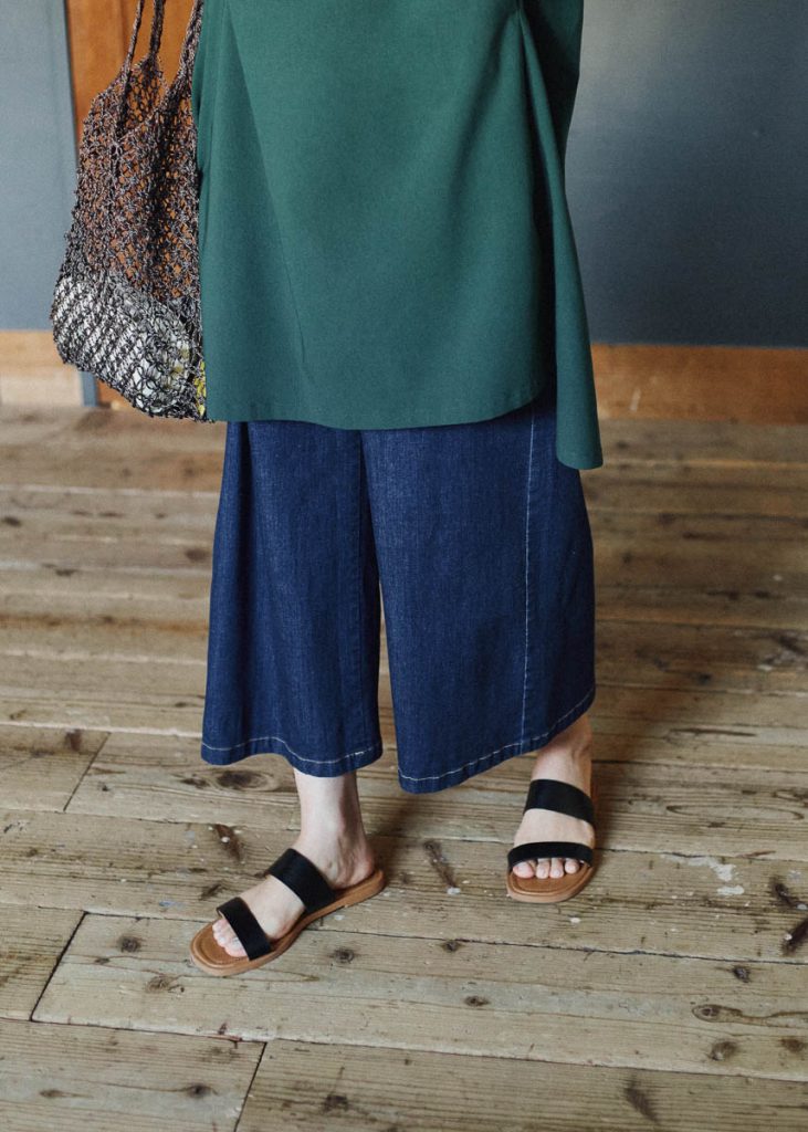 特に日帰り旅行の時は、朝家を出てから夜に帰宅するまで、1日中街歩きをして、カフェや美術館を訪れたり、散策中に見つけた川辺に降りたり、夜は上品な店でディナーといった具合に様々なシーンを過ごすこともしばしば。それだけにきちんと感もありつつ、ノンストレスな着心地も重要です。ボトムには、気兼ねなく履けるデニムをチョイス。ワイドで8分丈のガウチョシルエットは涼しげに着られるので夏の鉄板パンツとして活躍してくれるはず。足首見せをすることで自然とメリハリのある足元に。仕上げに、サングラス、ネットバッグやカゴバッグ、フラットサンダルといった夏小物を合わせたら、ほんのりモードな気分で楽しむ“日帰り旅のお手本スタイル”が完成です。