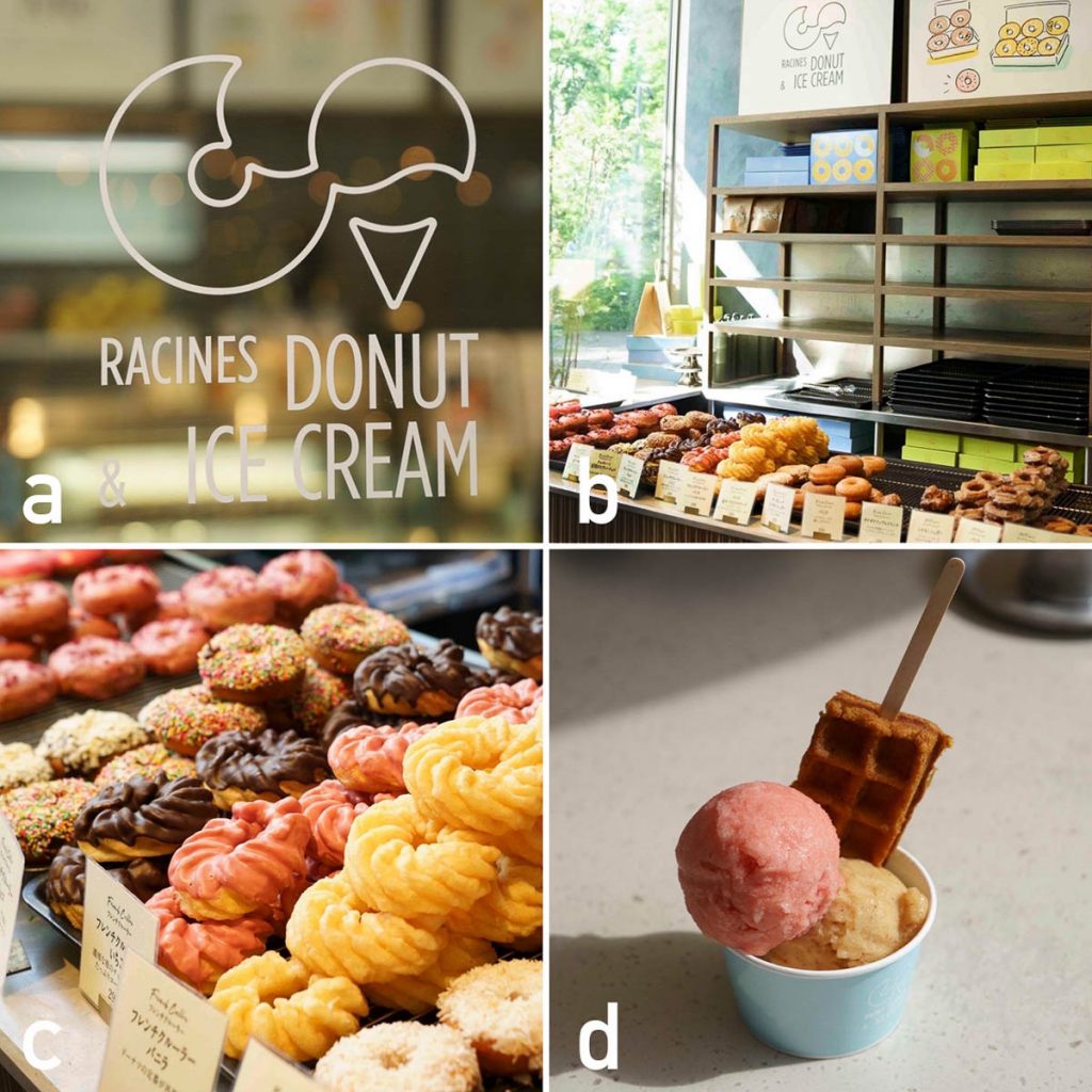 a.作りたてのドーナツとアイスクリーム、どちらも楽しめるって最高! b.店内の看板やグラフィックにも注目!オリジナルのテイクアウトボックスもオシャレ。 c.ラシーヌのドーナツは、見た目が華やかなものも多いからホームパーティーのテーブルを彩る一品としても重宝しそう。 d.フードロス問題に配慮し、B品やC品のフルーツを使って作られるジェラート。(ダブル¥480、トッピングしたワッフル¥120)