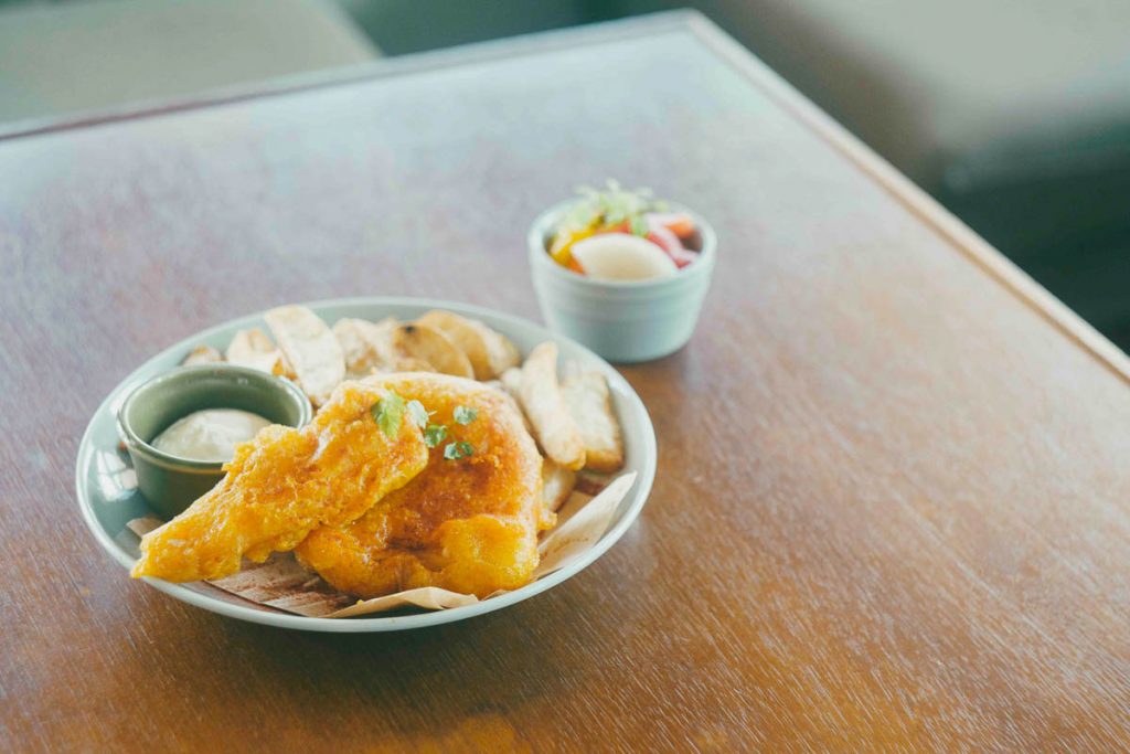 ビールのお供とえばフィッシュ&チップスも見逃せない。ボリューム満点のフィッシュ&チップス。外はカリカリ、中はフワフワのフィッシュ。彩り野菜をさっぱりとした風味に仕上げたピクルスとのコンビネーションも最高!