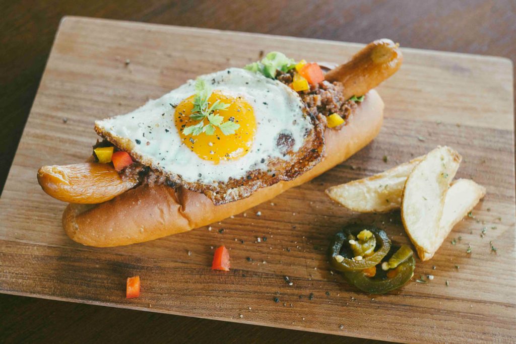 風味豊かなこだわりソーセージにボロネーゼソース。とろっと半熟タマゴとともに頬張って味わいたいホットドック。