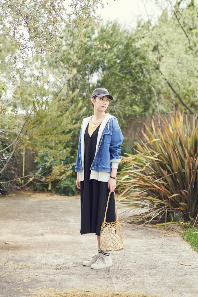 時間帯によって寒暖差のある秋口。例えば、終日出かける予定の週末は、こんな風に羽織ものもレイヤードしておけば、気温に合わせて脱いだり、羽織ったり、場合によっては肩にかけたり腰に巻いたりできる。女っぽさのはずし、としてのカジュアルアウターも素敵だけれども、今回のテーマはあえての“ちょっとボーイッシュ”。インするコーディネートの主役のジャンパースカートとそのインナー以外は、ボーイも着るアイテムを意識して選ぶといい。キャップとスニーカーで“追いボーイズ”。バッグは、バックパックやウエストポーチもばっちりハマるけど、あえてネットバッグで抜け感を。まだ少し夏の残り香を漂わせつつ、次の季節へ。夏秋ミックスなファッションを楽しめるのもこの時期ならではの醍醐味。