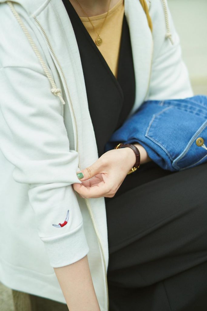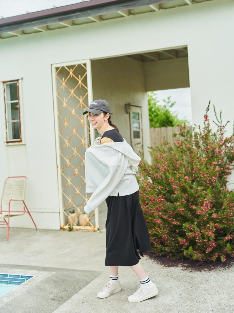 ▷デニムジャケット&パーカの下に着るアイテムは、カジュアルなレディ感を意識すると“ちょっぴりボーイッシュ”なバランスがとりやすい。