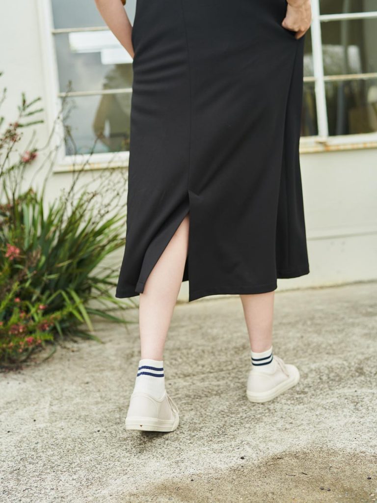しわができにくく、伸縮性のある人気素材の“ポンチ”を使用したジャンパースカート。顔まわりをすっきりと見せてくれる深めのVネック、バックスタイル裾に入ったベンツスリットが大人カジュアルな着こなしを叶えてくれる。両サイドには、ポケットも施されています。