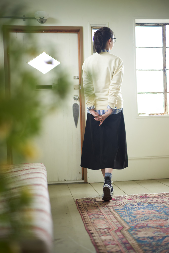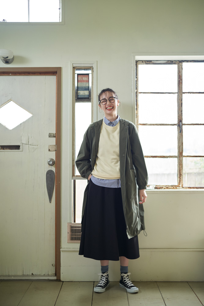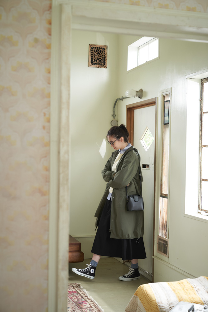 クローゼットの新定番として迎えたい、ミリタリー感のある「撥水オーバーコート」は、着こなし次第で秋から春まで長く着られるアイテム。名前の通り撥水生地を使っているので、ちょっとした雨の日のアウターとしても便利です。コートの下は、この秋気になるトラッド感のあるレイヤードスタイルに。スウェットもシャツもギャザースカートも、ジャンセン的定番アイテムではあるけれど、このように着てみるとまた新鮮な気分で楽しめるはず。