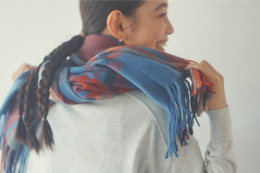 お出かけの際には、チェック柄のストールを首に巻いて、スタイリングに彩りをプラス。そのままぐるりと首に巻いてもかわいいし、モデルのようにラフに首の後ろで結うのも素敵。時々、こっそりと顔をうずめて、ふわふわのぬくもり感を満喫してみて。また、肌寒い時のブランケットやちょっとした羽織としても活躍する大判サイズなところもポイントです。