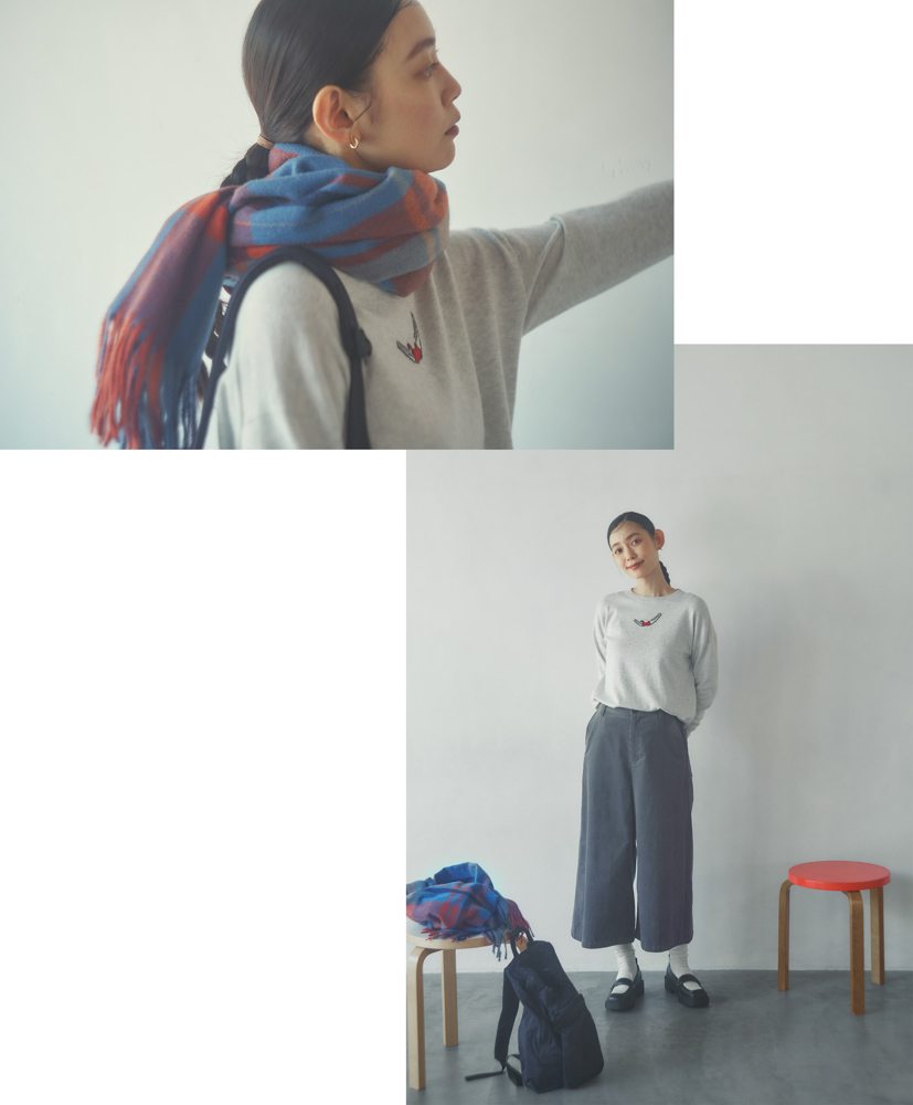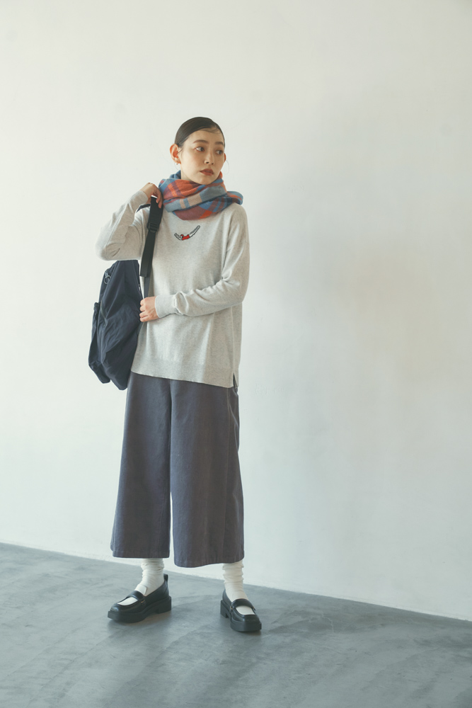 クルーネックニット¥8,800、キュロットパンツ¥7,700、チェックストール¥3,289(※11月発売予定)/ジャンセン その他 参考商品およびスタイリスト私物 *記載の価格は全て税込