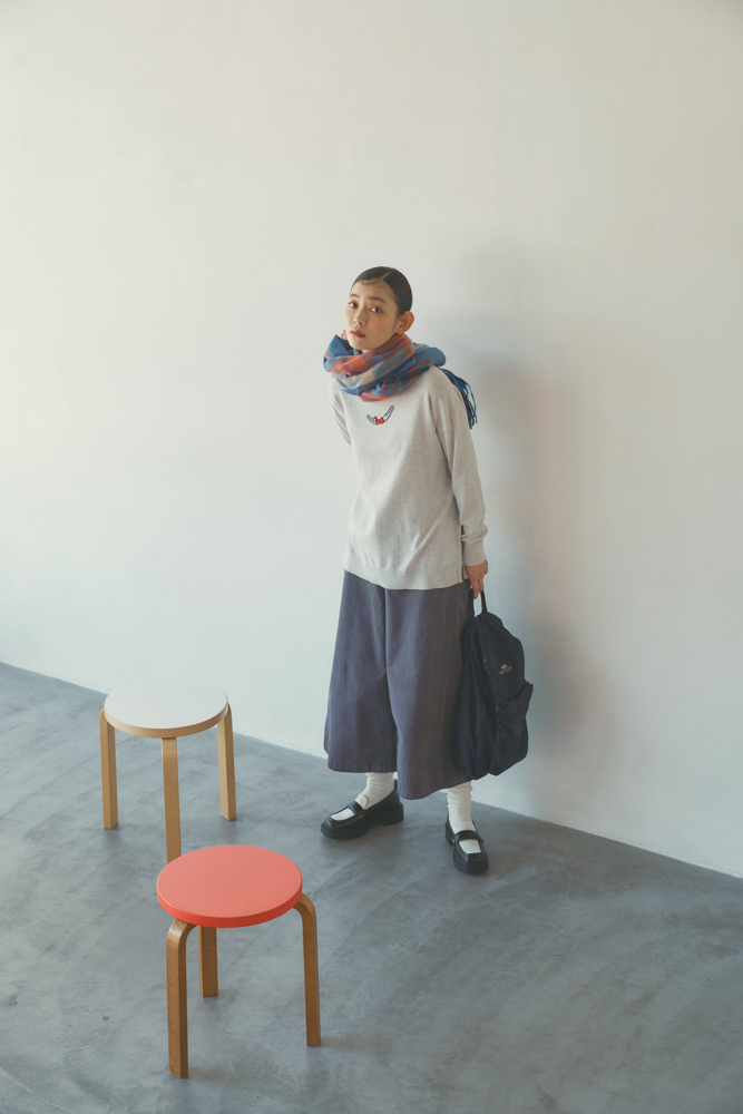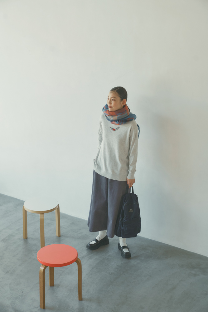 ジャンセンの新作ニットは、お馴染み“ダイビングガール”がキャッチーな一着。シンプルさの中にひとさじの遊び心があって、いつもの普段着コーデをアップデートしてくれる。ニット特有のチクチク感はナシ!ふんわりなめらかな肌触りがクセになるセーターです。合わせたのは、ゆるっとラフな着こなしが叶うキュロットパンツ。着こなしにメリハリがつく絶妙丈もポイント。