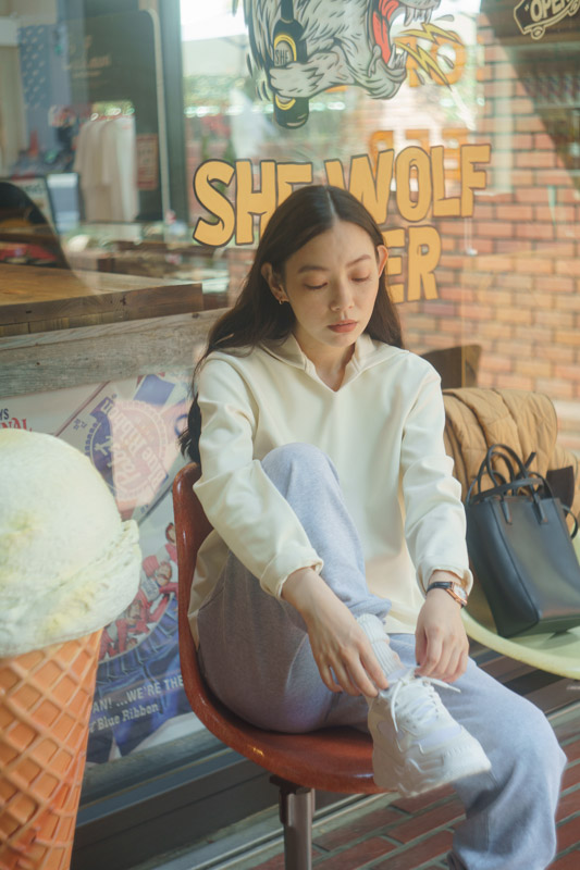 パンツの裾はソックスインするとストリートっぽいこなれ感が出せるし、今っぽいバランスの足元に。さらに、シンプルなピアスやネックレス、腕時計などアクセサリー類をプラスすることで、ぐっとスタイリングの完成度が高まります。ヘアもメイクもラフにまとめて、心地よさ重視のヘルシームードで。