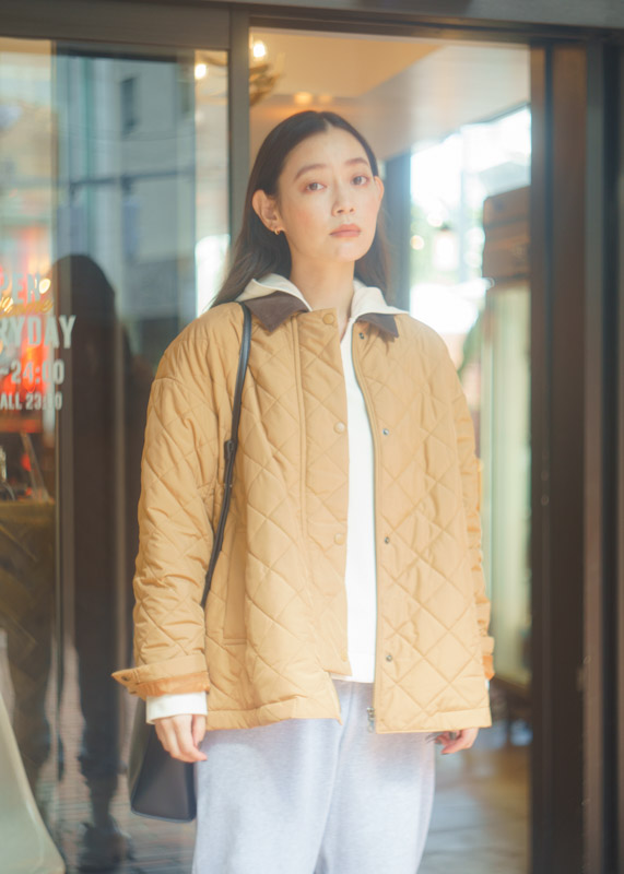▷キルトジャケットの袖口をひと折りして、中のトップスの袖を覗かせると手元がもたつきにくく、抜け感を出せる。