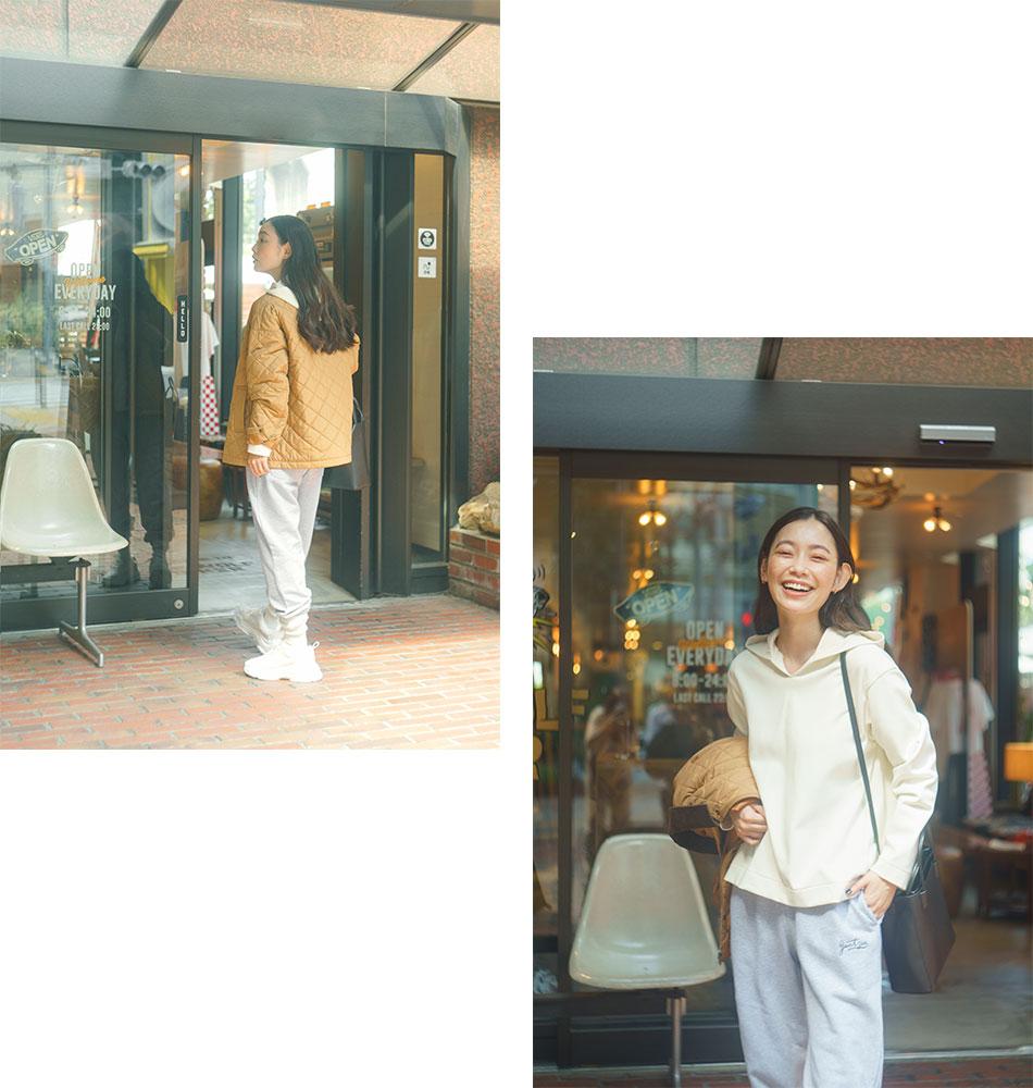 その昔、防寒用のアンダーウエアとして生まれたキルティングが、ファッションとして世に広まったのは1980年代のこと。今や定番アウターの1つとなった“キルトジャケット”。フェミニンな着こなしのハズしとしても素敵だけれど、今季は、思い切ってラフでボーイッシュなスタイルにも落とし込んでみたい。今回、中に着たのは“ボンディングパーカ”と“スウェットパンツ”のスポーティなコーデ。