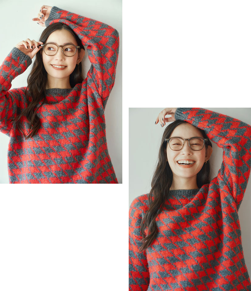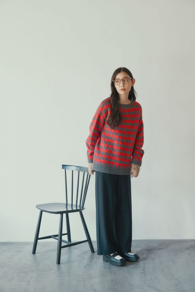 大きめの千鳥柄の主役級ニット。ふわふわと柔らかな手触りで着心地も◎。シンプルなボトムと合わせるだけで、印象的な大人カジュアルが完成します。カラーは、ホリデーシーズンにぴったりなモデル着用のレッドと、モノトーンならではのムードが魅力的なブラックの2種をラインナップ。