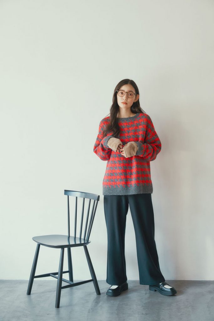 千鳥ニット¥11,000、ストレッチワイドパンツ¥7,700/ジャンセン その他 参考商品およびスタイリスト私物 *記載の価格は全て税込