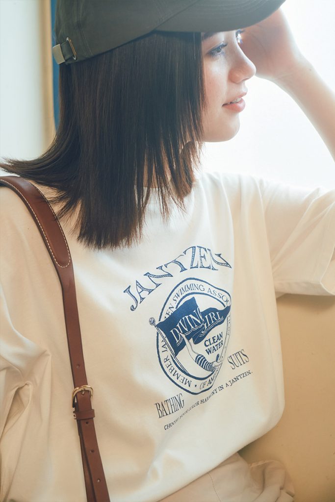 オールドスクールなムードが魅力のカレッジTシャツ。モチーフは、過去のJANTZENロゴをベースにしてINEMOUSEさんがアレンジしたもの。手描き文字、ダイビングガールフラッグのしなやかなはためき、ヴィンテージライクなプリント感など、シンプルなデザインながら作家ならではのエレガントな要素が詰まった一着。ベースとなるTシャツは、カレッジTらしいユニセックスな印象を覚える、ゆったりとしたサイジングのBOXシルエット。