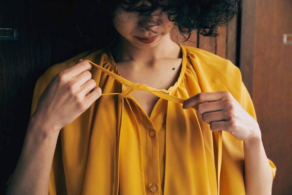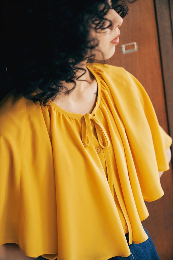 肩から肘上あたりまでを包み込むケープカラーは、ジョーゼット生地のケープならではの軽やかな落ち感もポイント。ギャザーを生かしたロマンティックで大ぶりな襟ながら、質感や色味のバランスで甘すぎないデザインに仕上げています。さりげなく着こなしにアクセントを添える襟元の共布のリボンは、よりフェミニンな気分で着たいときは結ってみる、すこし甘さをおさえたいときは結わずにおろしてみるなど、気分で楽しんで。