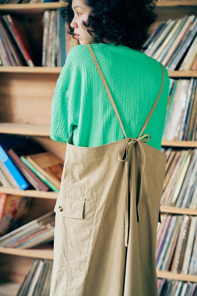 トレンドのカーゴパンツに憧れつつ、ちょっとメンズライクすぎる……と思っていた人こそトライして欲しいこのジャンパースカート。カーゴパンツらしいポケットやざっくりとしたボリューム感は生かしつつ、フレアシルエットや細めの肩ひもなど、フェミニンな要素を取り入れて、大人の女性でもデイリーに着やすいようにデザインされているので、手持ちのTシャツやタンクトップなどカジュアルなアイテムとレイヤードしても程よく女性らしく、かつ甘すぎない着こなしが可能。