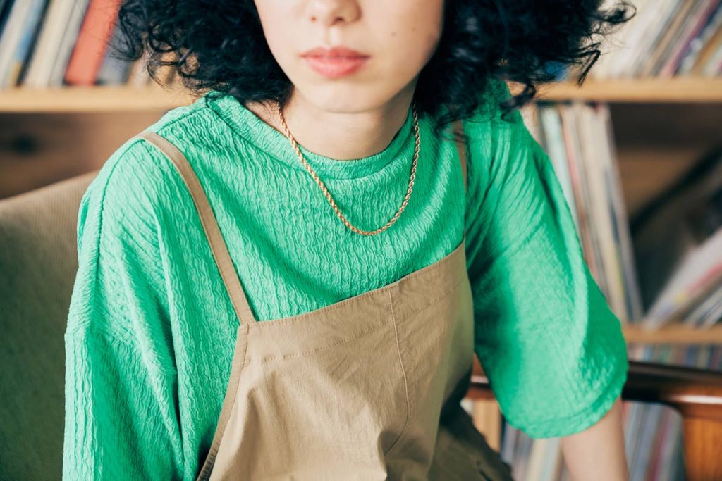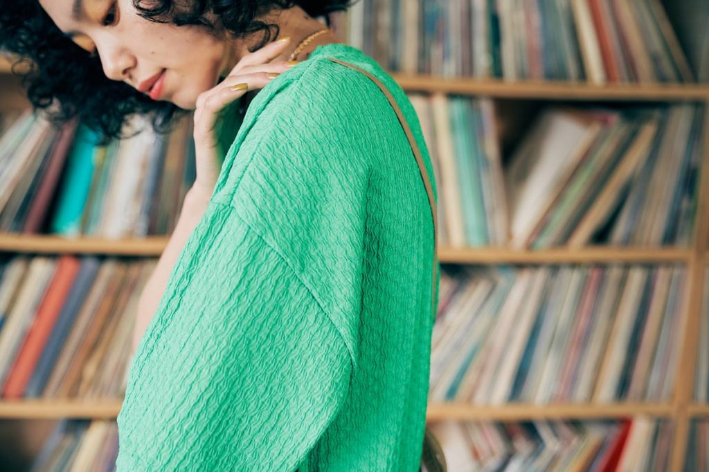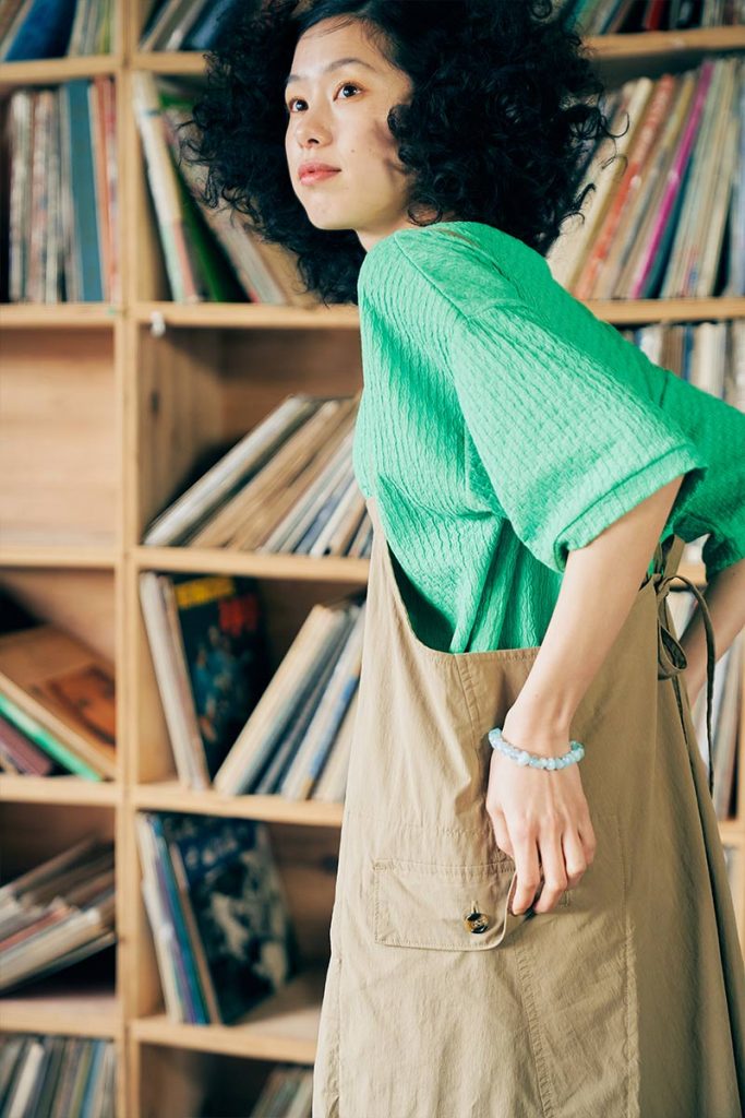 スタイリングにアクセントを添えるグリーンのプルオーバーは、ケーブル編みのようなジャカード生地で仕立てられていて、シンプルにパンツやスカートと合わせてもスタイリングにひとひねりあるニュアンスを加えてくれる技ありトップス。ありそうでないアイテムなので、一着持っておくとコーデの幅を広げてくれること間違いなしの一枚です。
