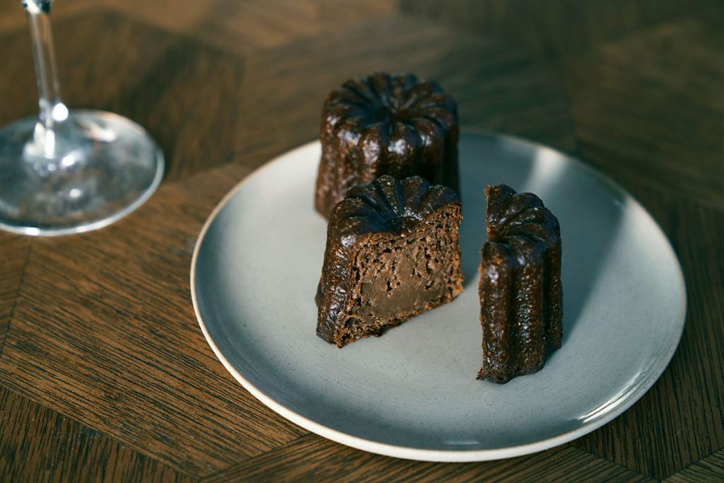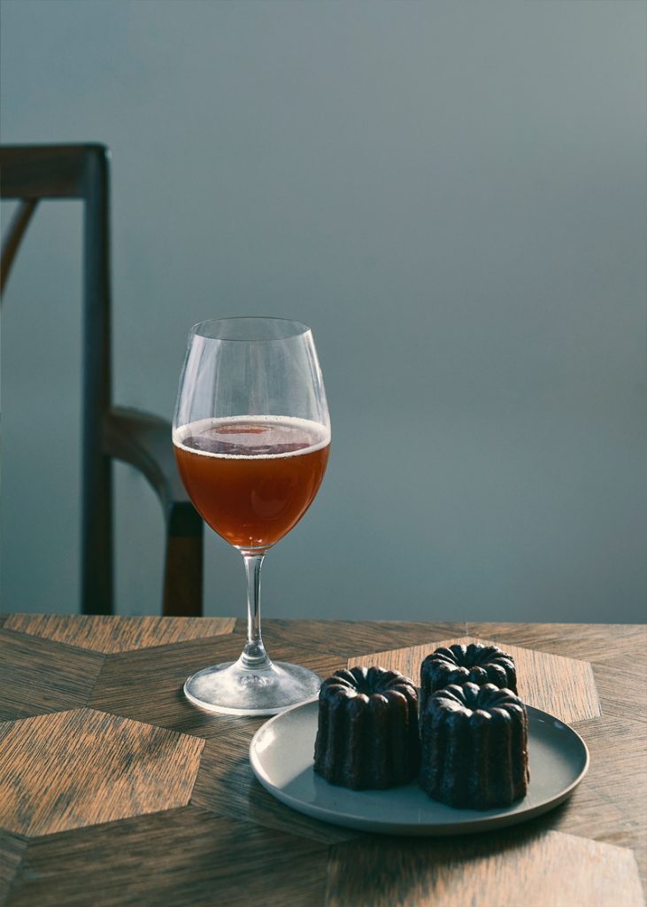ラズベリーが華やかに香る赤褐色のロマンティックなスパークリングティーは、フルーティーな甘さと爽やかな口当たりで、ワインに親しみのない人でも飲みやすい味わい。お供に選んだ“ワインに合うカヌレ”を手がけるのは、東京・学芸大学のカヌレ専門店〈Dans la Poche(ダン・ラ・ポッシュ)〉。今回チョイスしたのは定番フレーバーの1つである「ショコラバスク」。スパイスがきいたシックなチョコレートカヌレ。