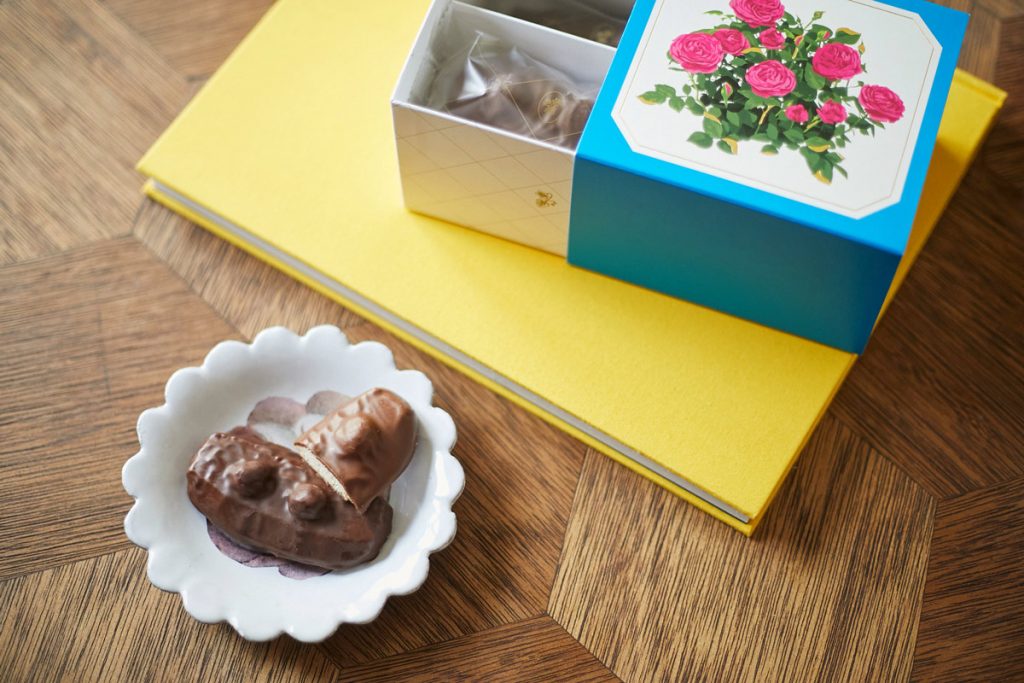 〈RURU MARY’S(ルル メリー)〉は、チョコレートのお菓子ブランド。花や果実などがデザインされた飾っておきたくなるような可愛らしいパッケージが目印。シグネチャー商品の1つである「ショコラサブレ」は、バターが香るさっくりとしたクッキーにナッツを乗せ、芳醇なチョコレートで包み込んだもので、クッキーの香ばしさにチョコレートとナッツのまろやかなコンビネーションがグッド。“ヘーゼルナッツ&スイートチョコレート”と“マカダミアナッツ&ミルクチョコレート”の2種類入り。