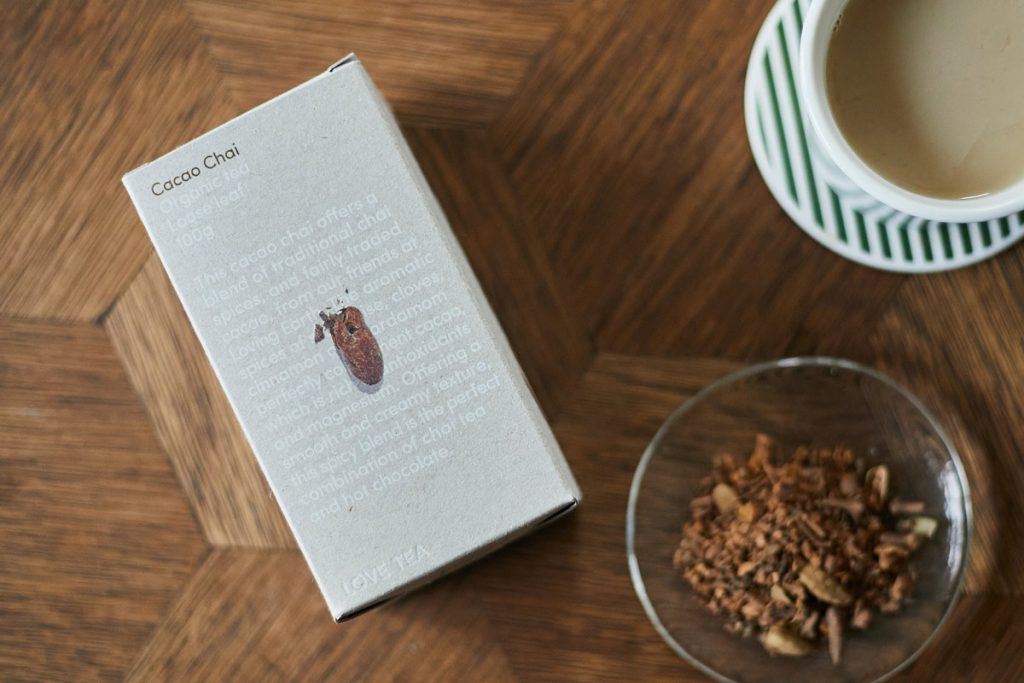 オーストラリア発、100%オーガニックのティーブランド〈LOVE TEA(ラブ・ティー)〉。製品はすべて、各素材が持つ際立つ個性や風味を生かしながらブレンド。また、環境への影響を最小限に抑えることにも注力しながら開発を続けている。「カカオ・チャイ」は、スパイスとホットチョコレートの絶妙なフレーバーが楽しめるお茶で、オーストラリアのチョコレートブランド〈Loving Earth(ラビングアース)〉のペルー産オーガニックカカオを使用。ストレートで飲むのはもちろん、茶葉とミルクを鍋で煮出してチャイラテにするのもおすすめ。抗酸化作用に優れ、マグネシウムが豊富なカカオをドリンクで美味しくいただこう。