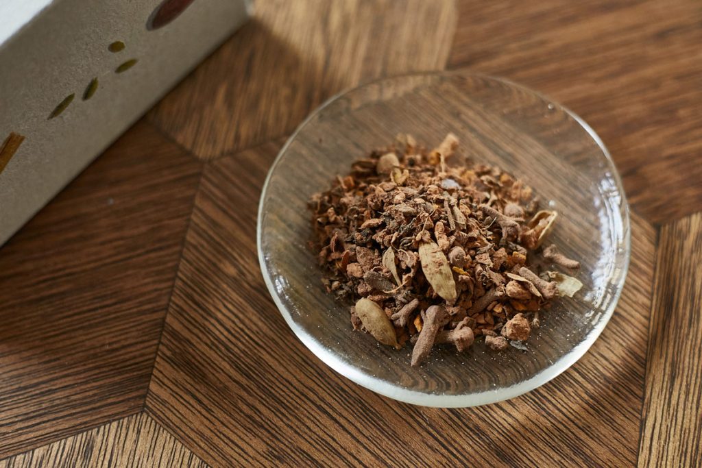 なんとなく疲れを感じていたり、どこか緊張している心身をじんわりと温めてやわらかくほぐしてくれるペアリングで、ご自愛ティータイム。お茶は、カカオとスパイスが香る〈LOVE TEA(ラブ・ティー)〉の「カカオ・チャイ」。香ばしいナッツが乗った〈RURU MARY’S(ルル メリー)〉の定番「ショコラサブレ」と共に味わいたい。