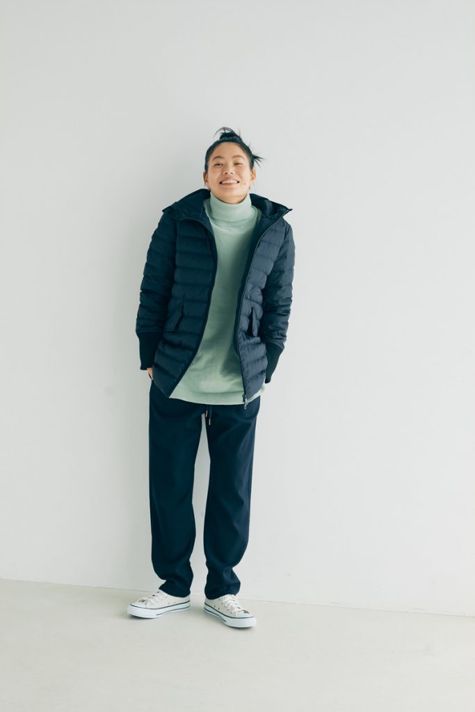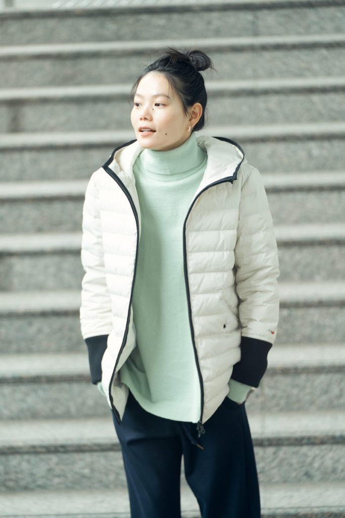 ダウンジャケットの中に着たのは、エアリーなミントカラーのタートルニットと、ネイビーのイージーバンツ。ネイビー、ホワイト、ベージュ、どのダウンジャケットとも好相性のコーディネートです。