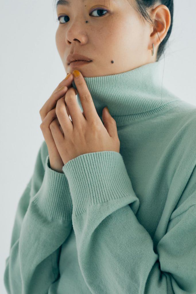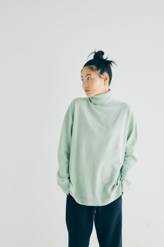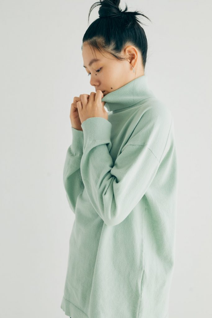 デイリーに着られる、肌あたりのよいタートルネックのニット。薄手でもたつかず、暖かく、ボディラインが出ない絶妙なゆとり感を意識してサイジング。襟は片畦編みで、後ろ側にスリットを入れることで窮屈すぎず程よいフィット感に。シャーベットトーンのミントグリーン(モデル着用)のほか、1枚あると便利なブラック、バリエーションに加えたいライトイエローの3カラー展開。