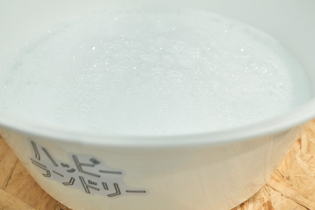 2.ふわふわと洗剤の泡が浮き上がる程度までしっかりと。「泡が洗う洋服を保護してくれるイメージで、上の写真を参考にしっかり泡立てましょう」