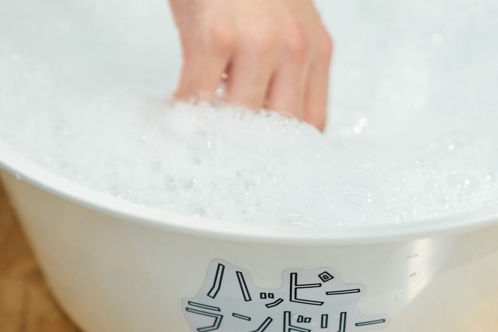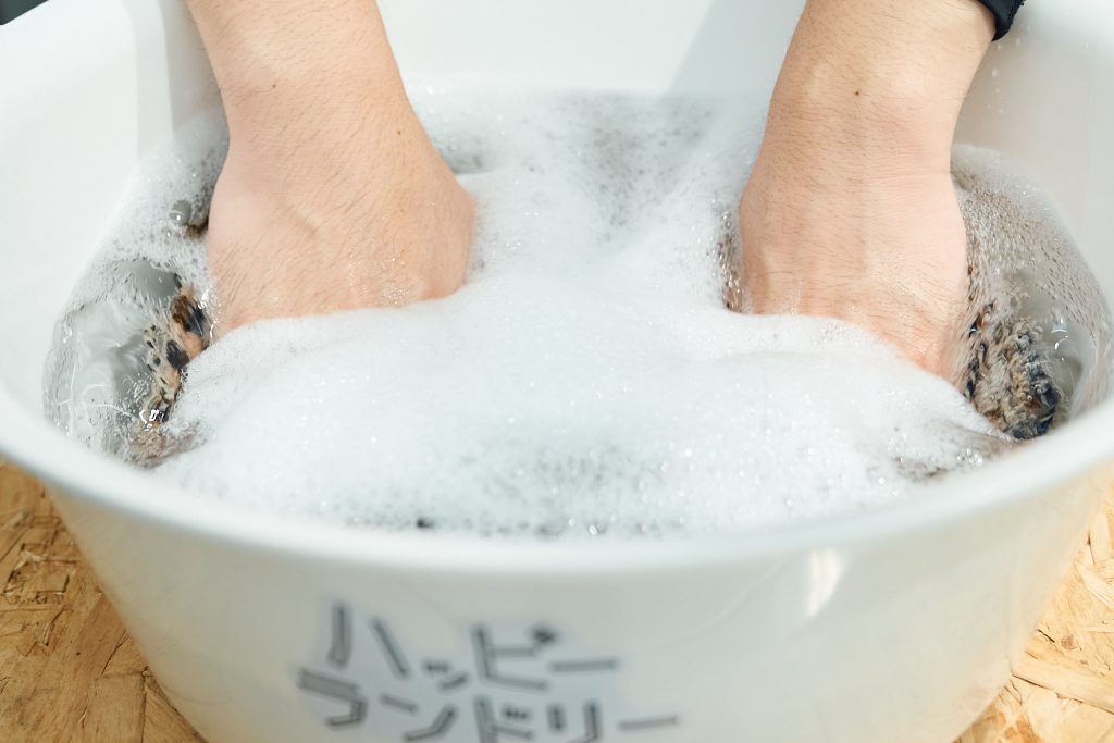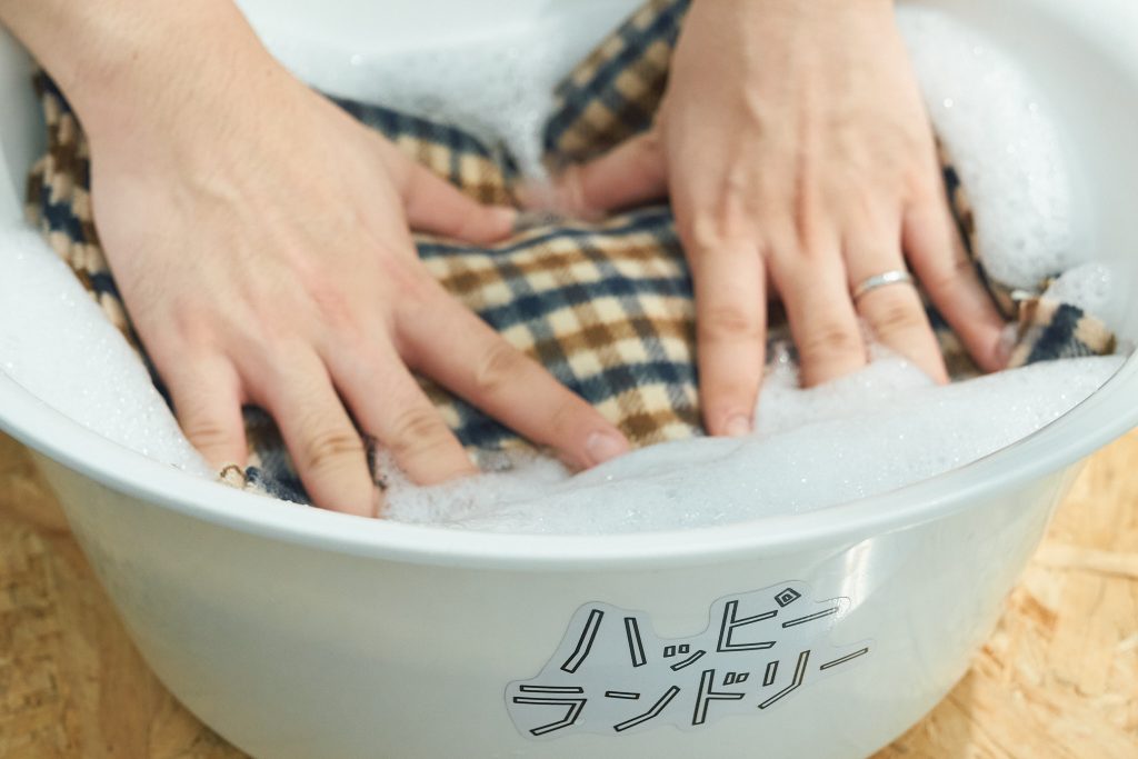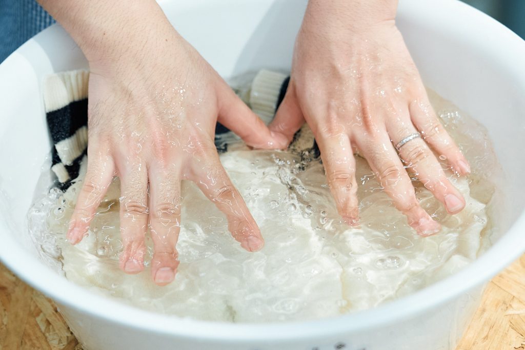 1.常温の水(30℃以下)を入れた洗濯おけに、適量の洗剤を加える(使用する洗剤の説明書きを読み、手洗いの希釈に適切な分量を)。洗剤を入れた水を手でよく泡立てる。