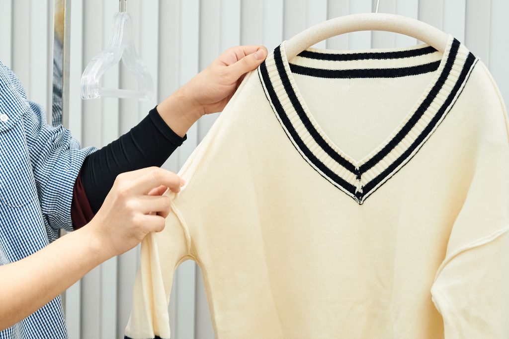 全体を水洗いする前のプレケア。洗濯するセーターを台の上に広げ、特に汚れが気になる箇所やシミの有無を確認する。着用で汚れやすい襟元や袖口は、手洗いでの汚れ落としが効果的な部分。